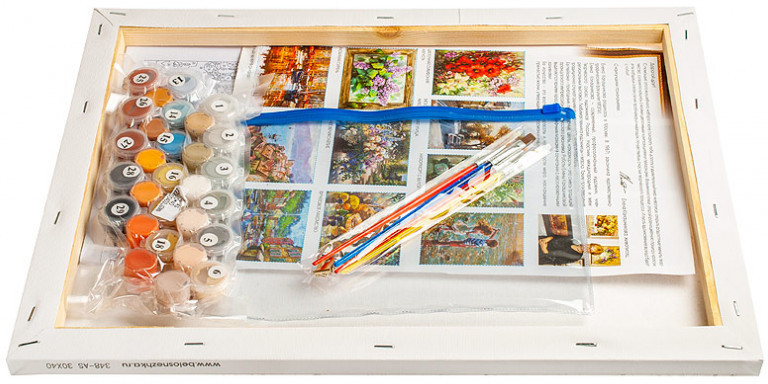 В этом наборе вы найдете холст на подрамнике, на который нанесены контуры рисунка, а также числа, указывающие на цвет, которым должна быть закрашена та или иная часть картины. Наносите краску нужного цвета на холст при помощи кисти, сверяясь с контрольной схемой. Это спокойное, неторопливое занятие подойдет и ребенку, и взрослому, к тому же оно помогает развить цветовосприятие, аккуратность и художественный вкус.