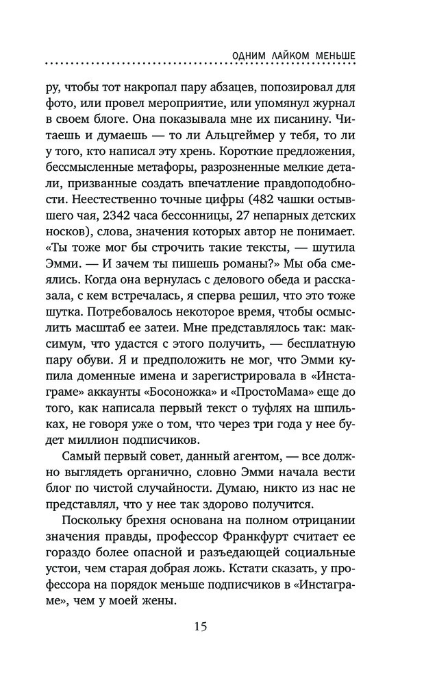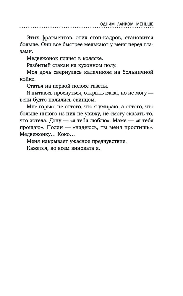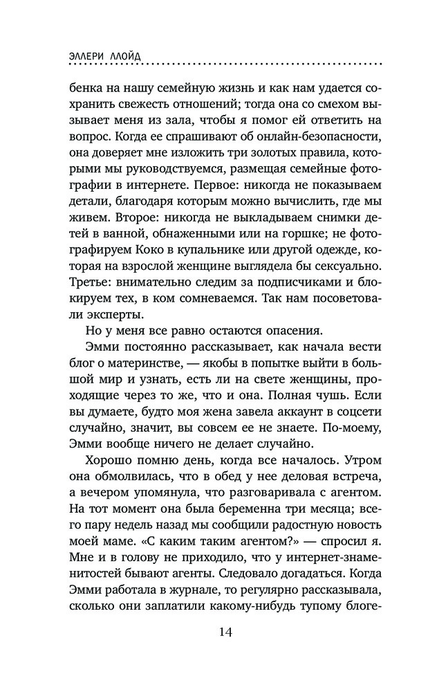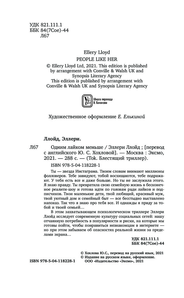 Серия: Tok. Блестящий триллер Ты — звезда Инстаграма. Твоим словам внимают миллионы фолловеров. Тебе завидуют, тобой восхищаются, тебе подражают. У тебя есть все и даже больше. Но ты не заслужила этого. Я знаю правду. Ты превратила свою семейную жизнь в бесконечное реалити-шоу и готова идти по головам ради лайков и подписчиков. Твои маленькие дети, твой любящий, красивый муж, твой уютный дом и семейный быт — все бесстыдно выставлено напоказ. Так что я знаю про тебя все. И однажды я приду за тобой и твоей семьей...В этом захватывающем психологическом триллере Эллери Ллойд исследует современную культуру социальных сетей: нашу отчаянную потребность в популярности и риски, на которые мы готовы пойти, чтобы понравиться незнакомцам в интернете — но при этом забываем об опасностях реальной жизни за пределами экрана... |