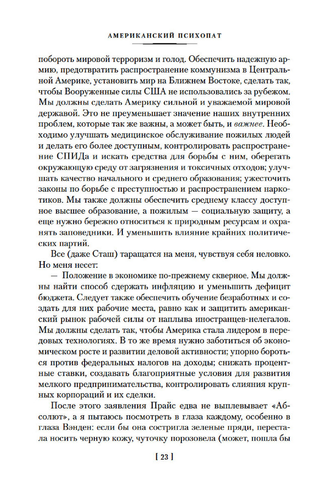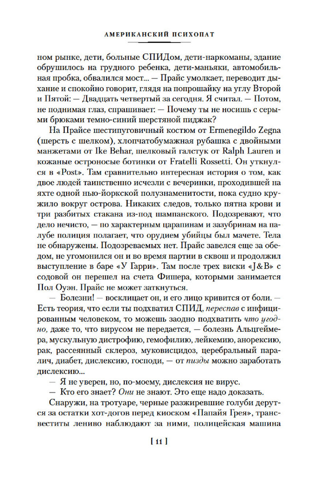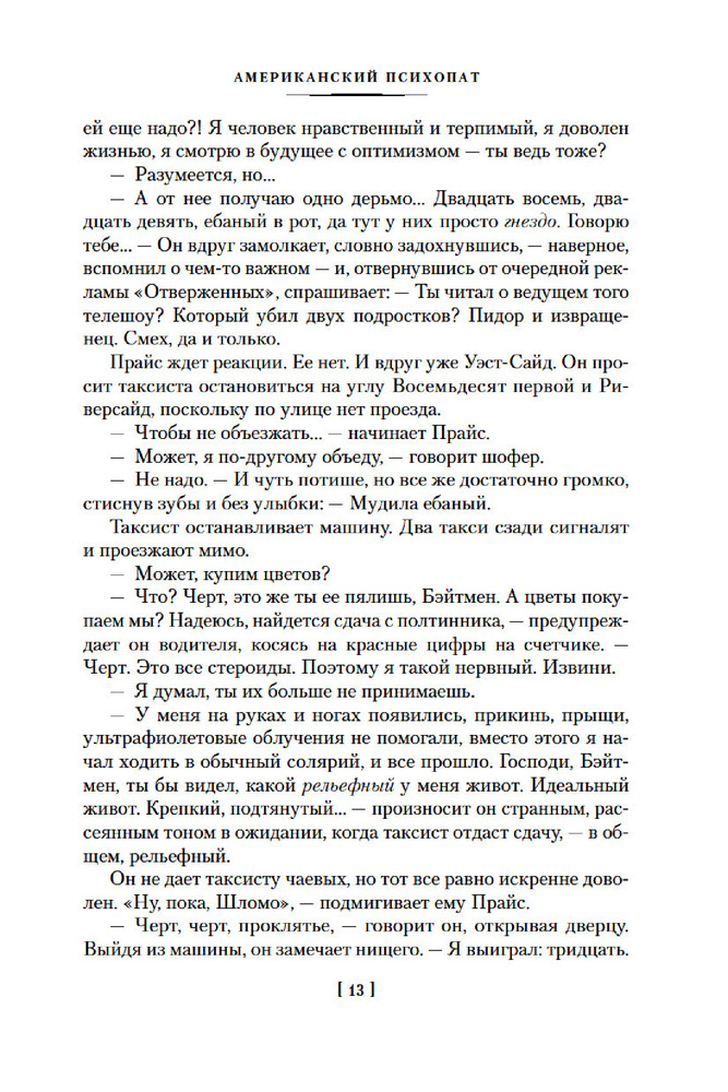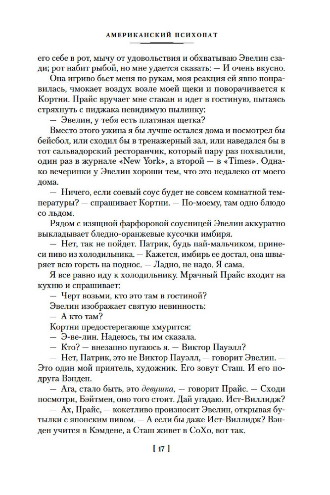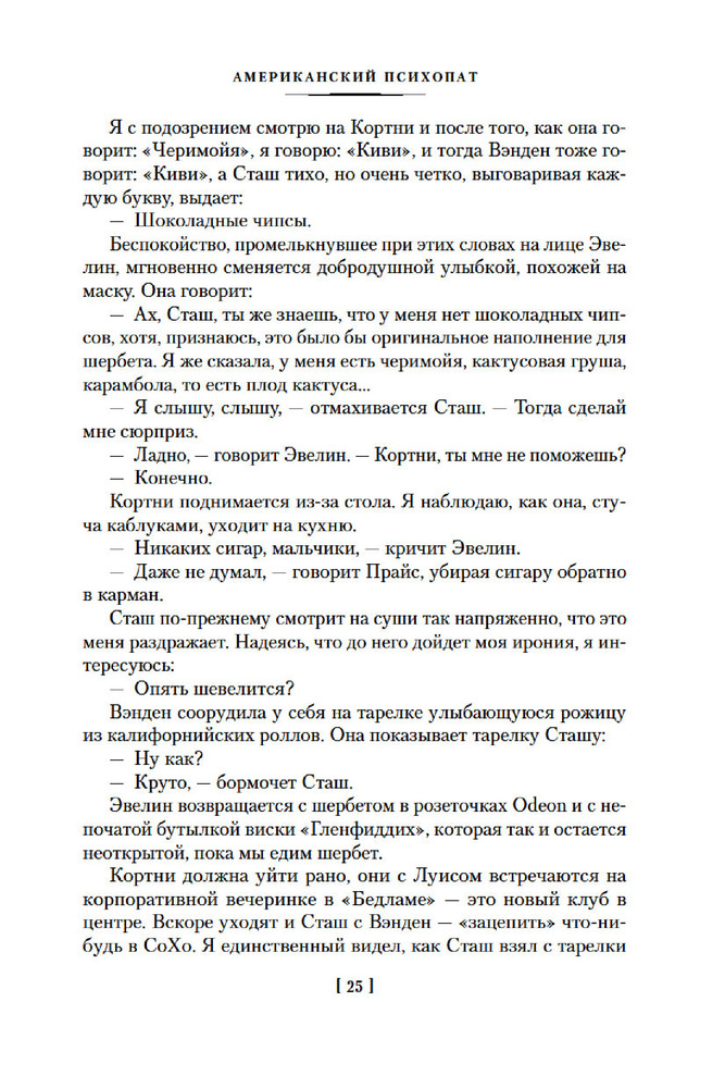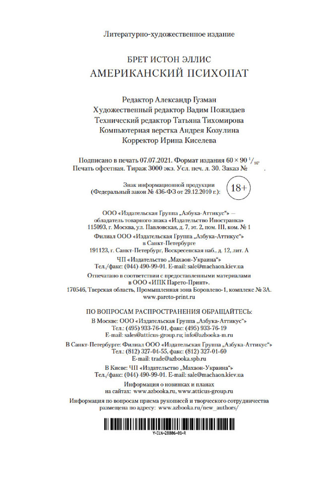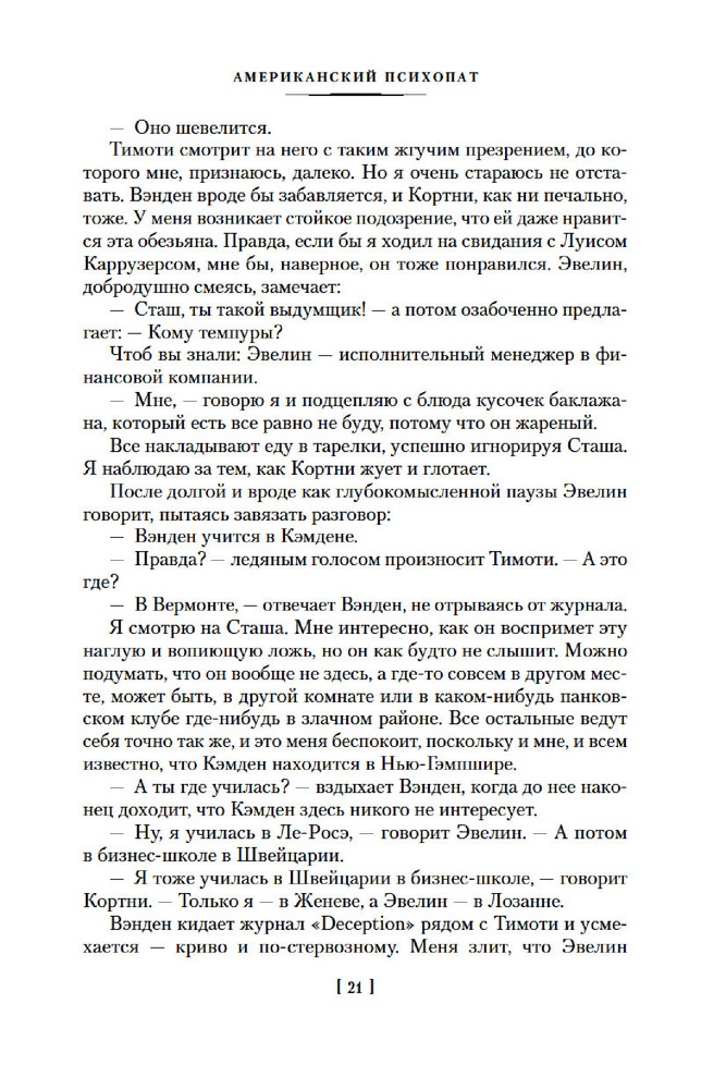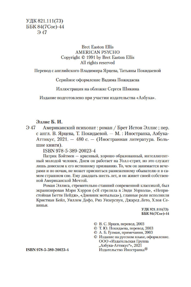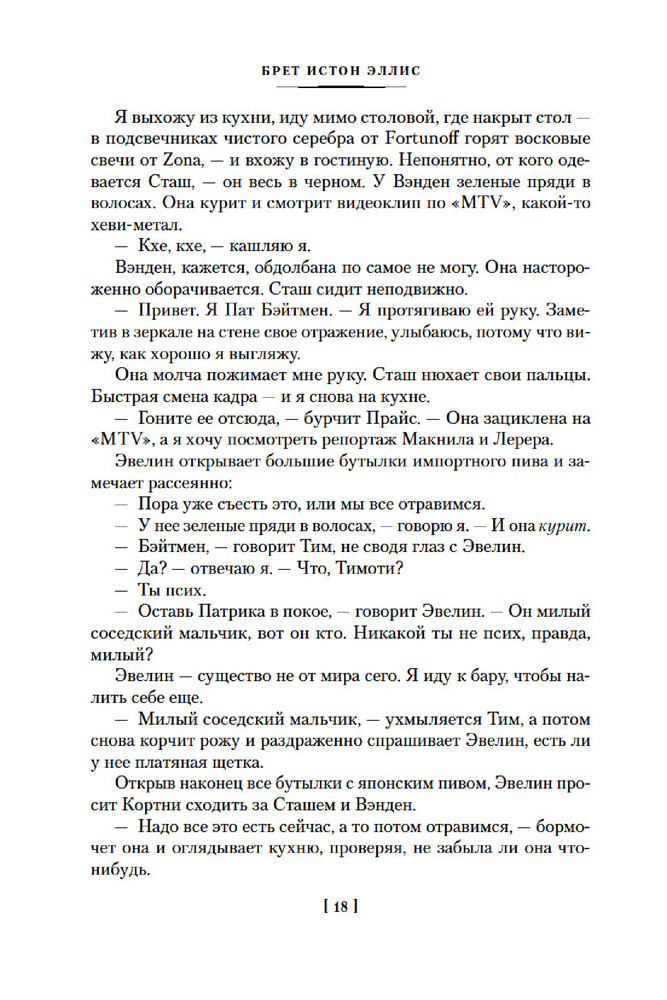 💳 Оплатить за товар можно при получении 🇰🇿 Есть бесплатная доставка по Казахстану от 1 дня 🎁 Копите бонусы с каждой покупки Серия: Иностранная литература. Большие книги Патрик Бэйтмен — красивый, хорошо образованный, интеллигентный молодой человек. Днем он работает на Уолл-стрит, но это служит лишь довеском к его истинному призванию. То, чем он занимается вечерами и по ночам, не может присниться разнеженному обывателю и в самом страшном сне. Ему двадцать шесть лет, и он живет своей собственной Американской Мечтой. |