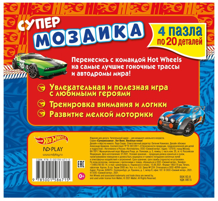 ND Play Книга-пазл. Хот ВилсВ данный момент этот товар отсутствует в продаже. Возможно, у нас найдется аналогичный или похожий товар здесь. Серия: Супермозаика Развивающая книга «Супермозаика. Hot Wheels» − увлекательная и полезная игра с командой лучших гоночных машин! Яркая книга с красочными иллюстрациями изготовлена из прочного картона, который сложно испортить водой или порвать. На каждом разворота ребенка ждет фрагмент истории и пазл из 20 деталей с героями мультфильма. Каждая книга состоит из 6 страниц и 4 пазлов. Супермозаика поможет развить логику, мелкую моторику, внимательность и скрасить досуг ребенка. |