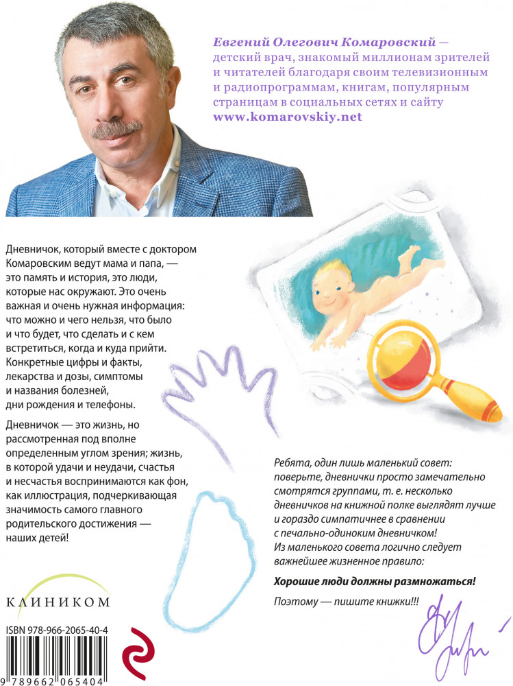 💳 Оплатить за товар можно при получении 🇰🇿 Есть бесплатная доставка по Казахстану от 1 дня 🎁 Копите бонусы с каждой покупки Серия: Комаровский представляет Дневничок, который вместе с доктором Комаровским ведут мама и папа, — это ценный помощник в повседневной заботе о малыше: что можно и чего нельзя, что было и что будет, что сделать и с кем встретиться, когда и куда прийти. Конкретные цифры и факты, лекарства и дозы, симптомы и названия болезней, дни рождения и телефоны. Дневничок — это жизнь, но рассмотренная под вполне определенным углом зрения; жизнь, в которой удачи и неудачи, счастья и несчастья воспринимаются как фон, как иллюстрация, подчеркивающая значимость самого главного родительского достижения — наших детей! |