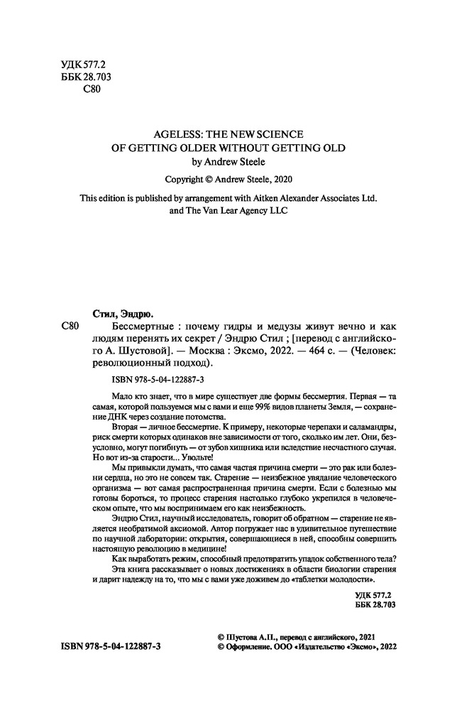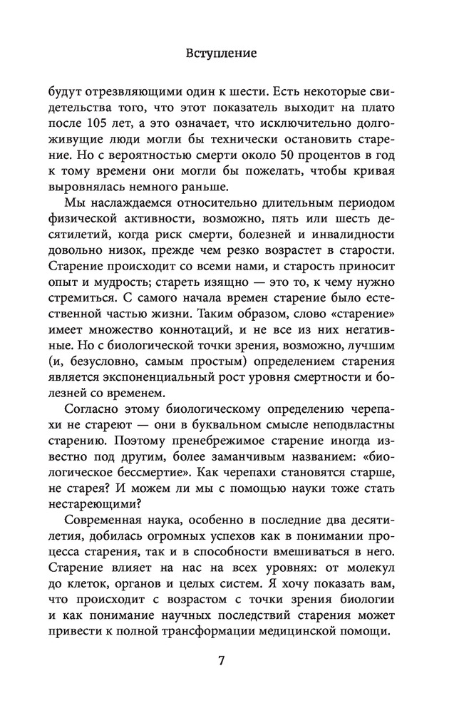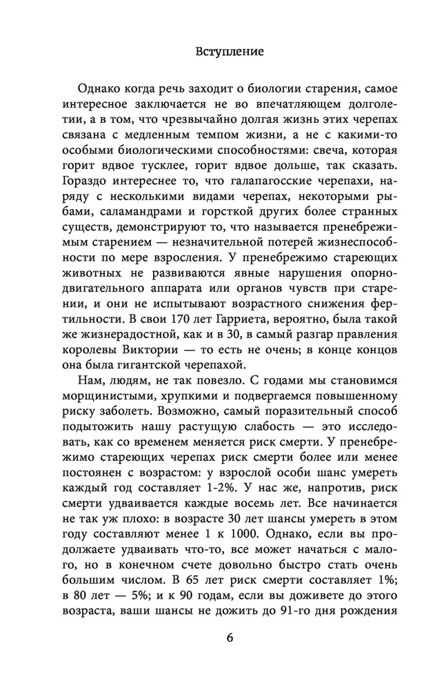 Бессмертные. Почему гидры и медузы живут вечно, и как людям перенять их секретВ данный момент этот товар отсутствует в продаже. Возможно, у нас найдется аналогичный или похожий товар здесь. Серия: Человек: революционный подход Мало кто знает, что в мире существует две формы бессмертия. Первая — та самая, которой пользуемся мы с вами и еще 99% видов планеты Земля — сохранение ДНК через создание потомства. Вторая — личное бессмертие. К примеру, некоторые черепахи и саламандры, риск смерти которых одинаков вне зависимости от того, сколько им лет. Они, безусловно, могут погибнуть — от зубов хищника или вследствие несчастного случая. Но вот из-за старости... Увольте! Мы привыкли думать, что самая частая причина смерти — это рак или болезни сердца, но это не совсем так. Старение — неизбежное увядание человеческого организма — вот самая распространённая причина смерти. Если с болезнью мы готовы бороться, то процесс старения настолько глубоко укрепился в человеческом опыте, что мы воспринимаем его как неизбежность. |