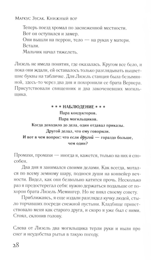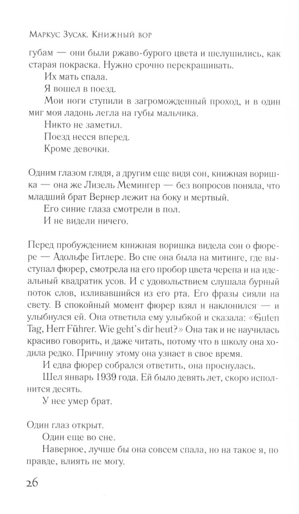 Книжный ворВ данный момент этот товар отсутствует в продаже. Возможно, у нас найдется аналогичный или похожий товар здесь. Серия: Интеллектуальный бестселлер Январь 1939 года. Германия. Страна, затаившая дыхание. Никогда еще у смерти не было столько работы. А будет еще больше. Мать везет девятилетнюю Лизель Мемингер и ее младшего брата к приемным родителям под Мюнхен, потому что их отца больше нет — его унесло дыханием чужого и странного слова «коммунист», и в глазах матери девочка видит страх перед такой же судьбой. В дороге смерть навещает мальчика и впервые замечает Лизель. Так девочка оказывается на |