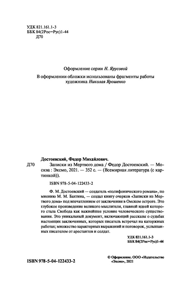 💳 Оплатить за товар можно при получении 🇰🇿 Есть бесплатная доставка по Казахстану от 1 дня 🎁 Копите бонусы с каждой покупки Серия: Всемирная литература (новое оформление) Ф.М. Достоевский — создатель «полифонического романа», по мнению М.М. Бахтина, создал книгу очерков «Записки из Мертвого дома» под впечатлением от заключения в Омском остроге. Это произведение великого мыслителя, главной идеей которого стала Свобода как важнейшее условие человеческого существования. Это уникальный документ, включающий рассказы о судьбах настоящих заключенных, которых писатель встречал на каторжных работах; множество характерных выражений и поговорок, услышанных писателем от арестантов и солдат. |