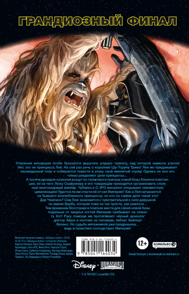 Включает выпуски комикса «Звёздные войны» (2015) № 62–75 и «Звёздные войны: господство Империи» Кирона Гиллена, Грега Пака, Анхеля Унсуэты, Андреа Броккардо, Guru-eFX, Фила Ното, Чарльза Соула, Итана Сакса, Саймона Спурриэра, Каспара Вейнгарда, Люка Росса, Паоло Вилланелли, Роланда Боши, Арифа Прианто, Ли Лафриджа и Рашель Розенберг. |