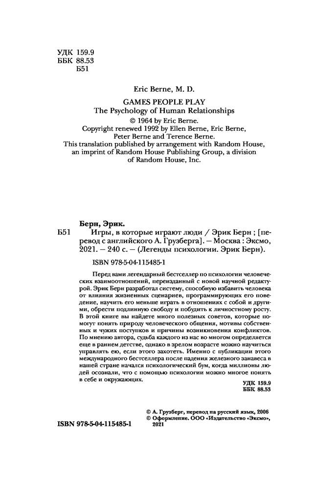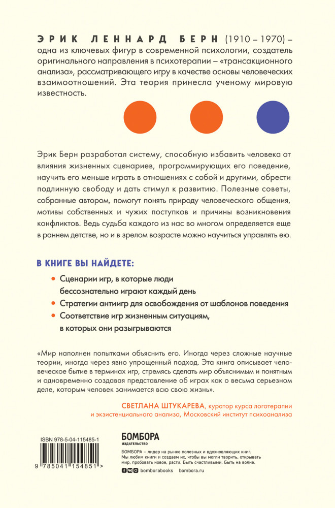 💳 Оплатить за товар можно при получении 🇰🇿 Есть бесплатная доставка по Казахстану от 1 дня 🎁 Копите бонусы с каждой покупки Серия: Легенды психологии. Эрик Берн (новое оформление) Перед вами легендарный бестселлер по психологии человеческих взаимоотношений, переизданный с новой научной редактурой. Эрик Берн разработал систему, способную избавить человека от влияния жизненных сценариев, программирующих его поведение, научить его меньше играть в отношениях с собой и другими, обрести подлинную свободу и побудить к личностному росту. В этой книге вы найдете много полезных советов, которые помогут понять природу человеческого общения, мотивы собственных и чужих поступков и причины возникновения конфликтов. По мнению автора, судьба каждого из нас во многом определяется еще в раннем детстве, однако в зрелом возрасте можно научиться управлять ею, если этого захотеть. Именно с публикации этого международного бестселлера после падения железного занавеса в нашей стране начался психологический бум, когда миллионы людей осознали, что с помощью психологии можно многое понять в себе и окружающих. |