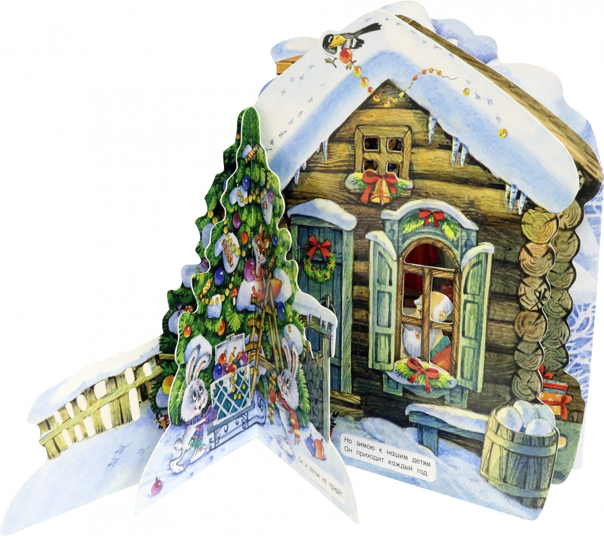Путешествие по домику сопровождает новогоднее стихотворение Нины Найдёновой «Зимний гость» — о Деде Морозе и весёлом празднике.