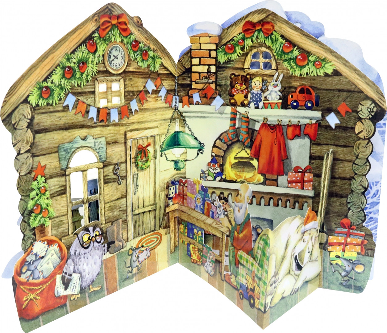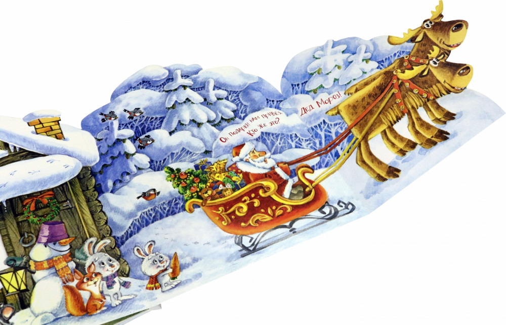 Фигурные страницы из плотного картона выглядывают одна из-за другой и показывают разные уголки в доме и вокруг него. Листая книжку, читатель словно заглядывает в ярко украшенную комнату и потом выходит во дворик — здесь уже ждут олени, готовые везти подарки.