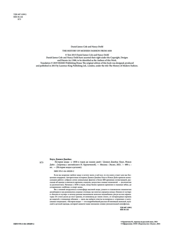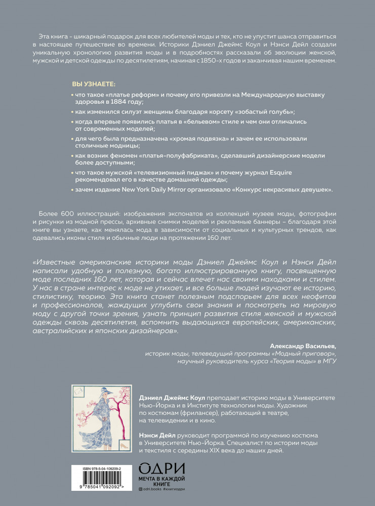 Историки Дэниел Джеймс Коул и Нэнси Дейл создали уникальную хронологию развития моды и в подробностях рассказали об эволюции женской, мужской и детской одежды по десятилетиям, начиная с 1850-х годов и заканчивая нашим временем. Вы узнаете: