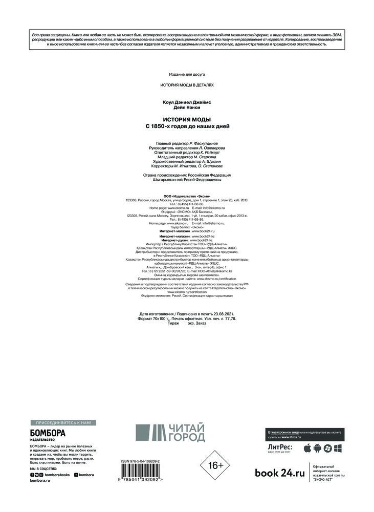 Более 600 иллюстраций: изображения экспонатов из коллекций музеев моды, фотографии и рисунки из модной прессы, архивные снимки моделей и рекламные баннеры — благодаря этой книге вы узнаете, как менялась мода в зависимости от социальных и культурных трендов, как одевались иконы стиля и обычные люди на протяжении 160 лет. |