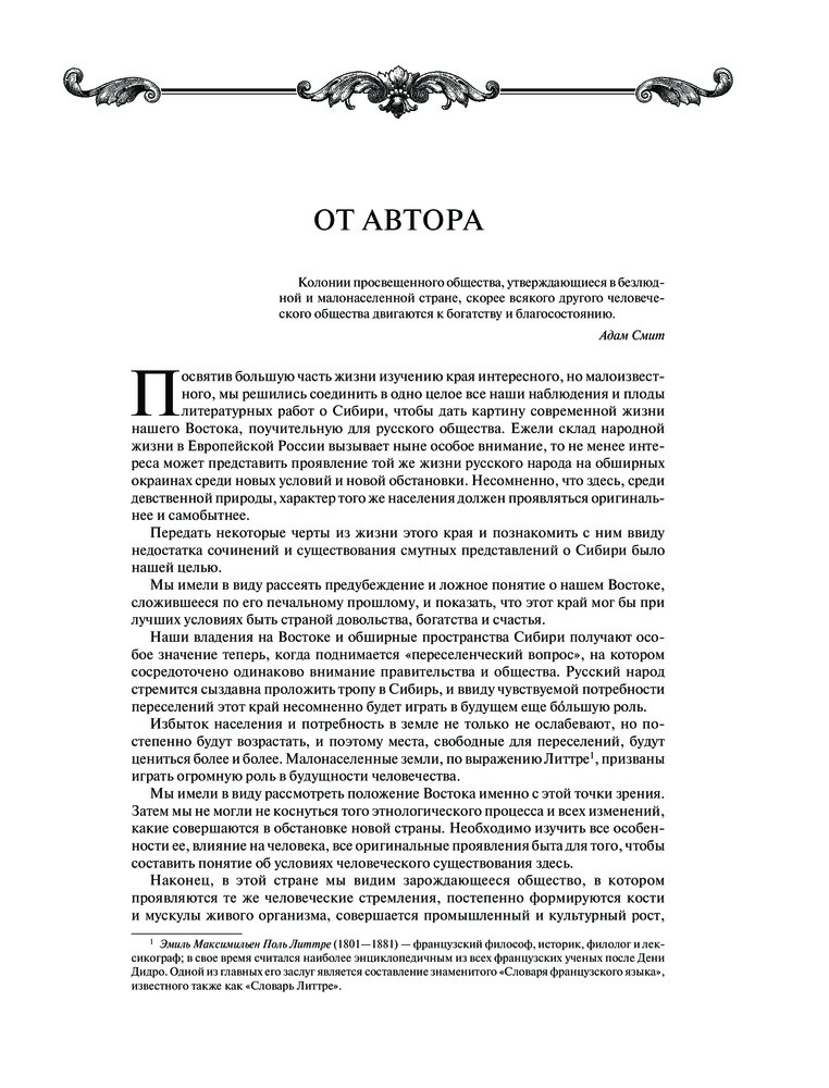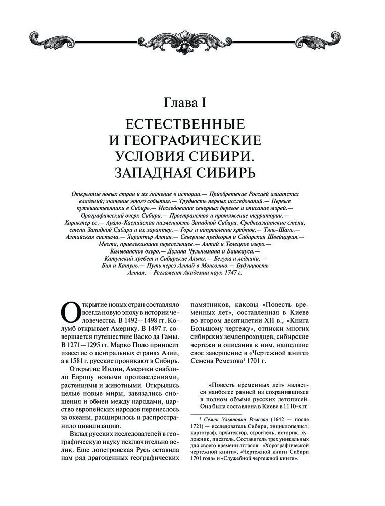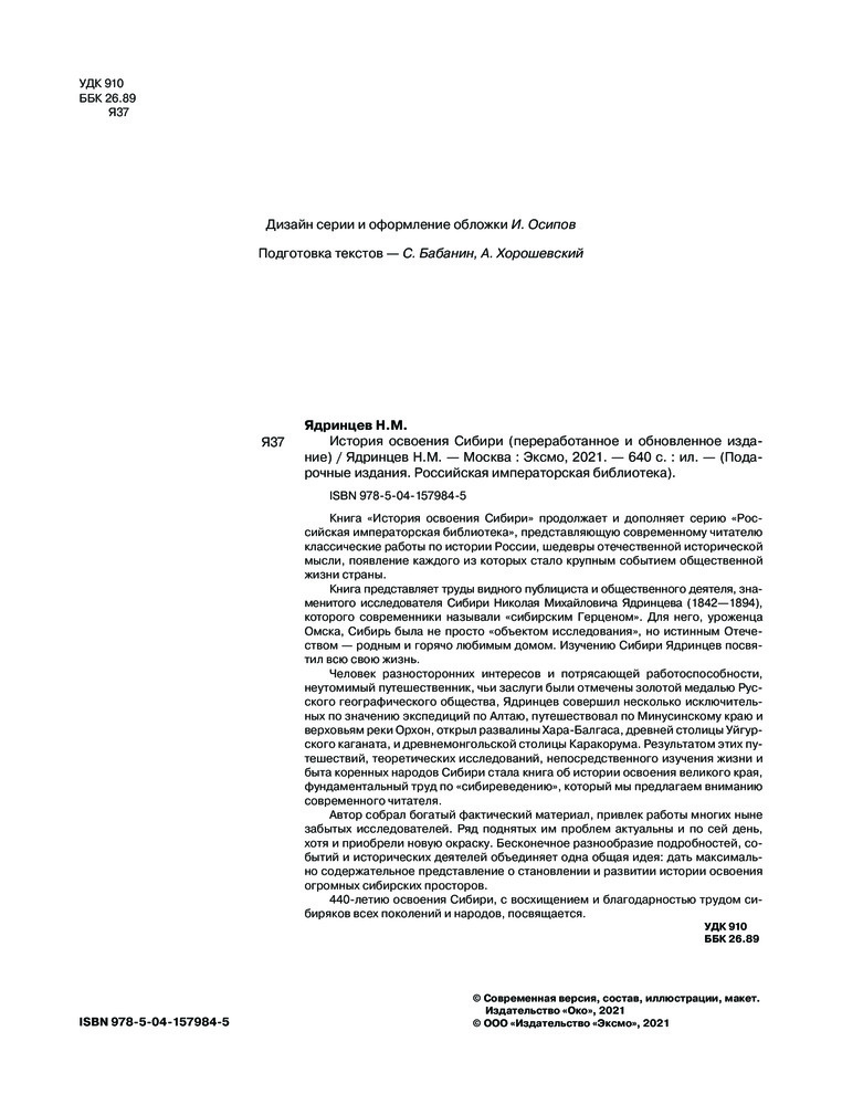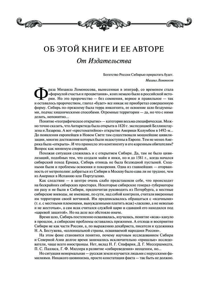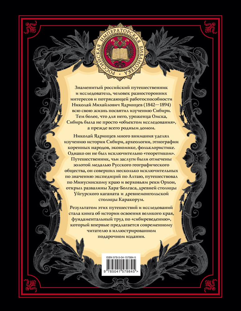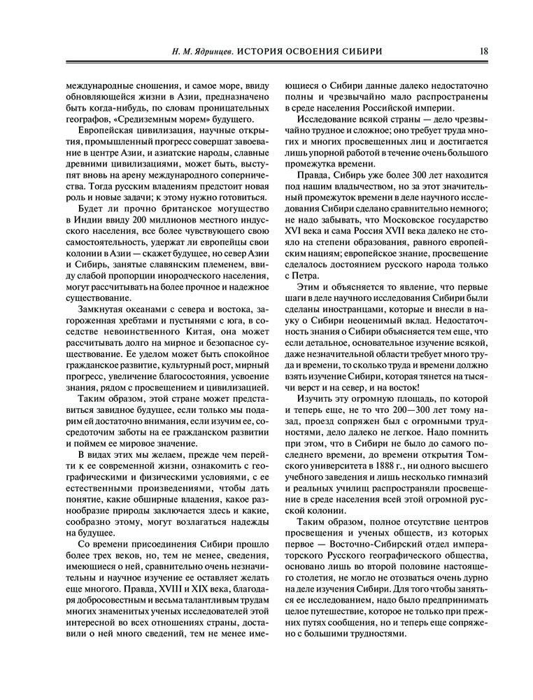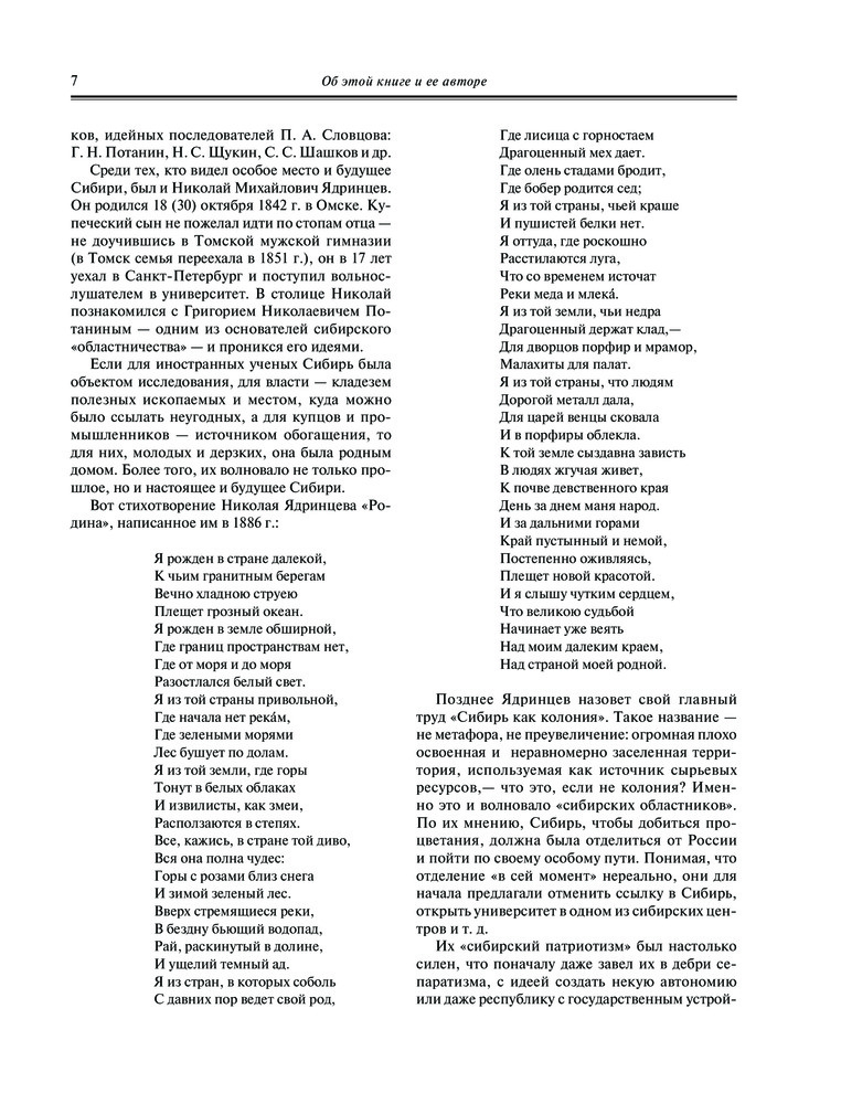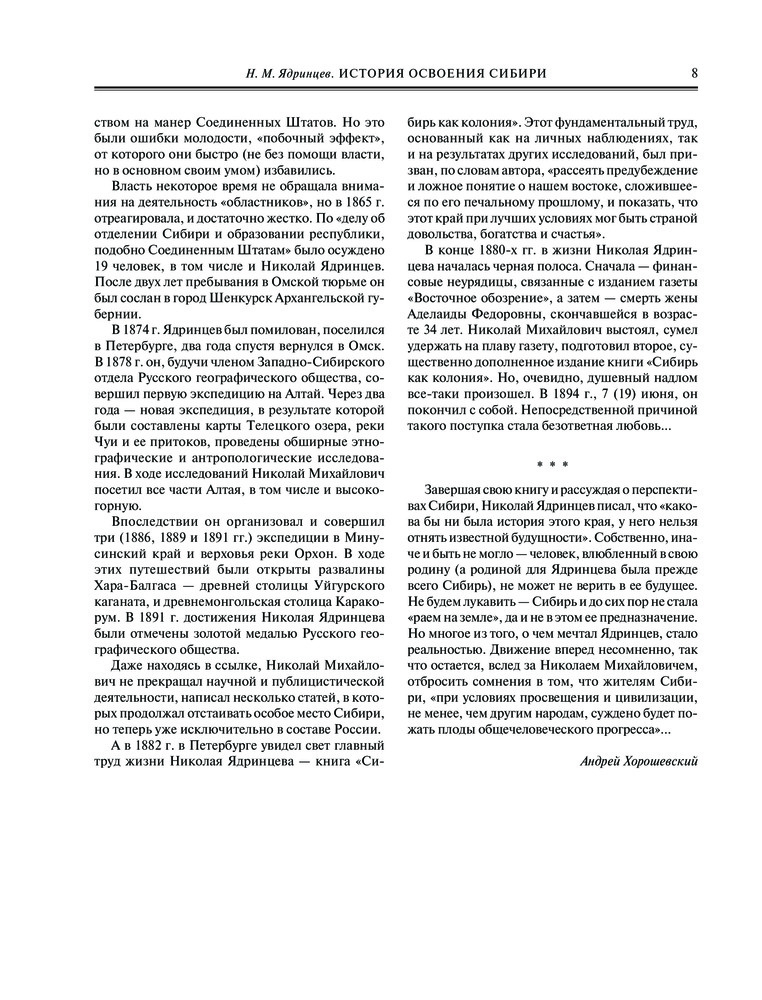 Изучению Сибири Ядринцев посвятил всю свою жизнь. Человек разносторонних интересов и потрясающей работоспособности, неутомимый путешественник, чьи заслуги были отмечены золотой медалью Русского географического общества, Ядринцев совершил несколько исключительных по значению экспедиций по Алтаю, путешествовал по Минусинскому краю и верховьям реки Орхон, открыл развалины Хара-Балгаса, древней столицы Уйгурского каганата, и древнемонгольской столицы Каракорума. Результатом этих путешествий, теоретических исследований, непосредственного изучения жизни и быта коренных народов Сибири стала книга об истории освоения великого края, фундаментальный труд по «сибиреведению», который мы предлагаем вниманию современного читателя.