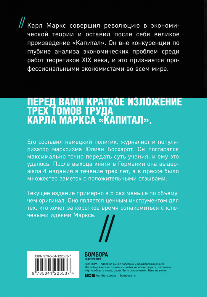 Текущее издание примерно в 5 раз меньше по объему, чем оригинал. Оно является ценным инструментом для тех, кто хочет за короткое время ознакомиться с ключевыми идеями Маркса. |