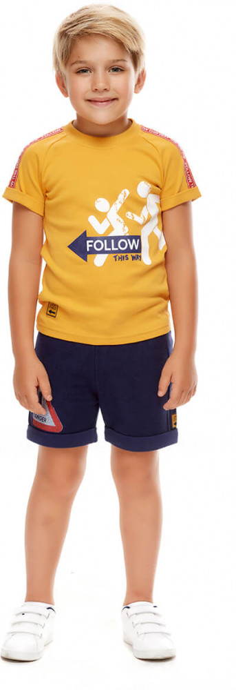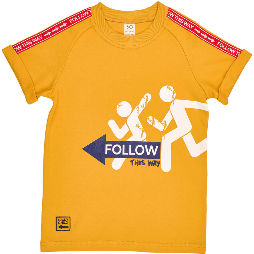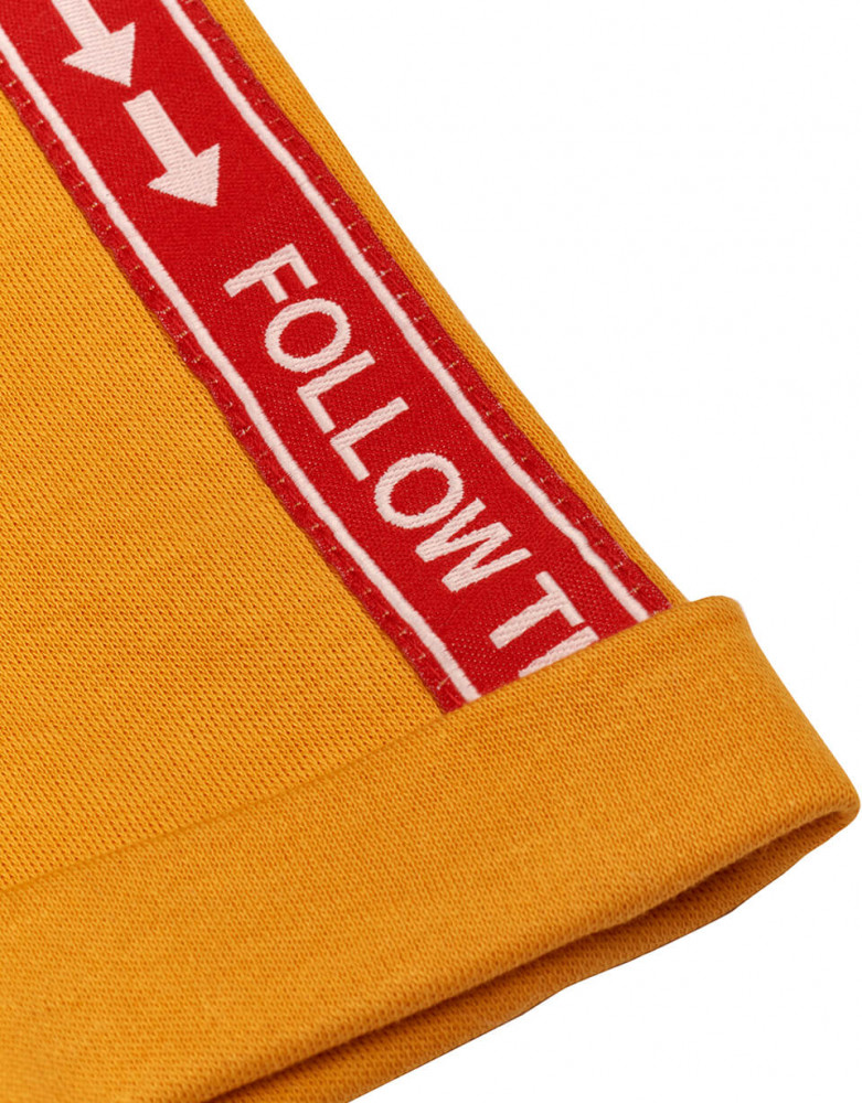 Футболка стильного горчичного цвета, имеет яркий дерзкий принт. Рукава украшены контрастной жаккардовой лентой с фирменным принтом. Выполнена футболка из хлопка высшего качества. Ткань мягкая и приятная к телу, не подвержена зацепкам и затяжкам. Сшита очень качественно, аккуратно. Нитки нигде не торчат.