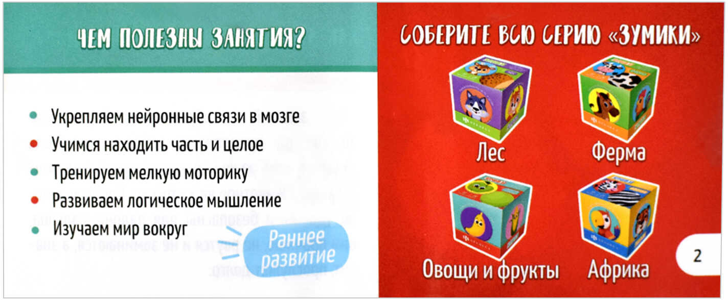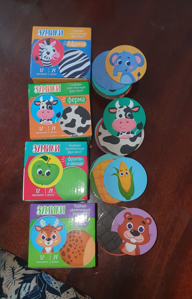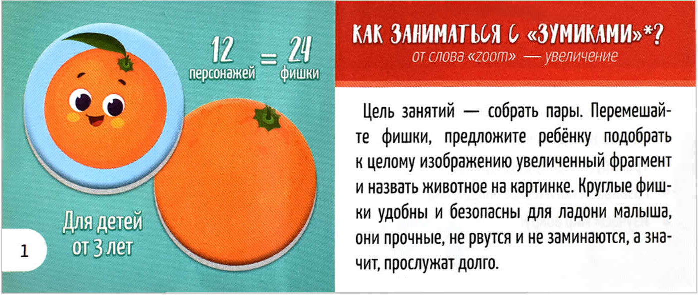 💳 Оплатить за товар можно при получении 🇰🇿 Есть бесплатная доставка по Казахстану от 1 дня 🎁 Копите бонусы с каждой покупки Серия: Зумики Наборы для раннего развития малышей. Цель занятий — собрать пары. Перемешайте фишки, предложите ребёнку подобрать к целому изображению увеличенный фрагмент. Круглые фишки удобны и безопасны для ладони малыша, они прочные, не рвутся и не заминаются, а значит, прослужат долго. Занятия с фишками учат находить часть и целое, укрепляют нейронные связи в мозге, развивают образное и логическое мышление, тренируют мелкую моторику. В серии представлены 4 актуальные темы: «Лес», «Ферма», «Африка», «Овощи и фрукты». |