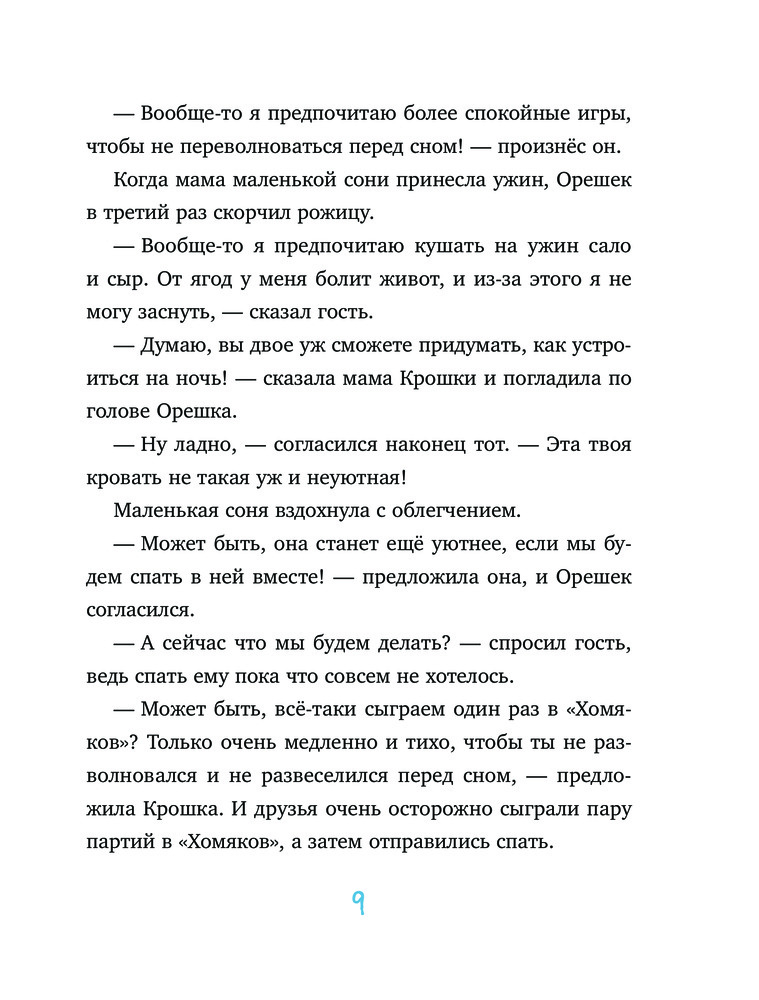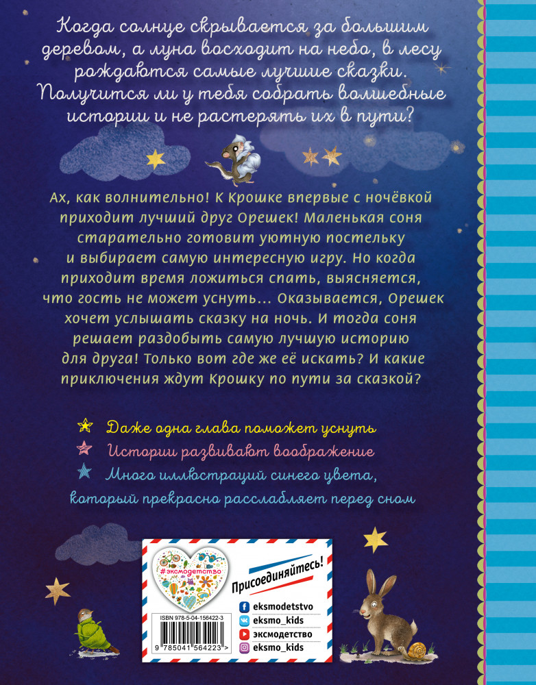 Одеяло со сказками. Выпуск 1В данный момент этот товар отсутствует в продаже. Возможно, у нас найдется аналогичный или похожий товар здесь. Серия: Детск. Добрые истории перед сном Крошка очень счастлива: к ней придёт с ночёвкой лучший друг Орешек! Чем же его порадовать? Точно! Можно приготовить уютную постельку и поиграть в «Хомяков»! Только вот когда приходит время ложиться спать, оказывается, что маленький гость не может заснуть без сказки на ночь. Но, к сожалению, соня не знает интересных историй... Получится ли у неё отыскать лучшую сказку и помочь другу уснуть? |