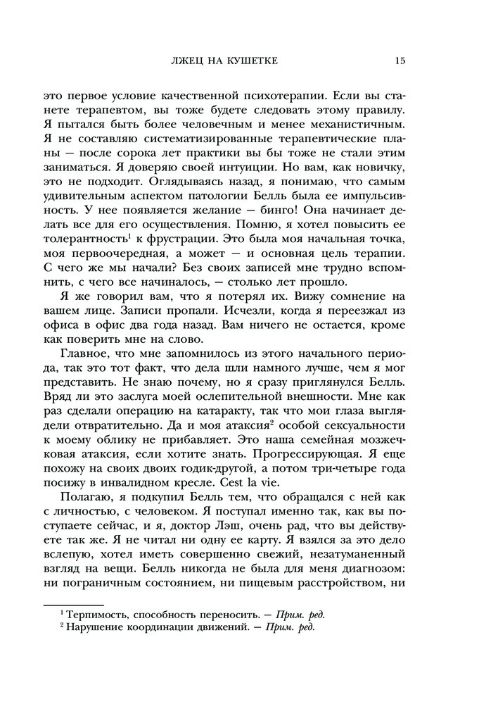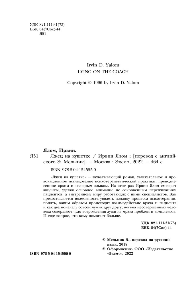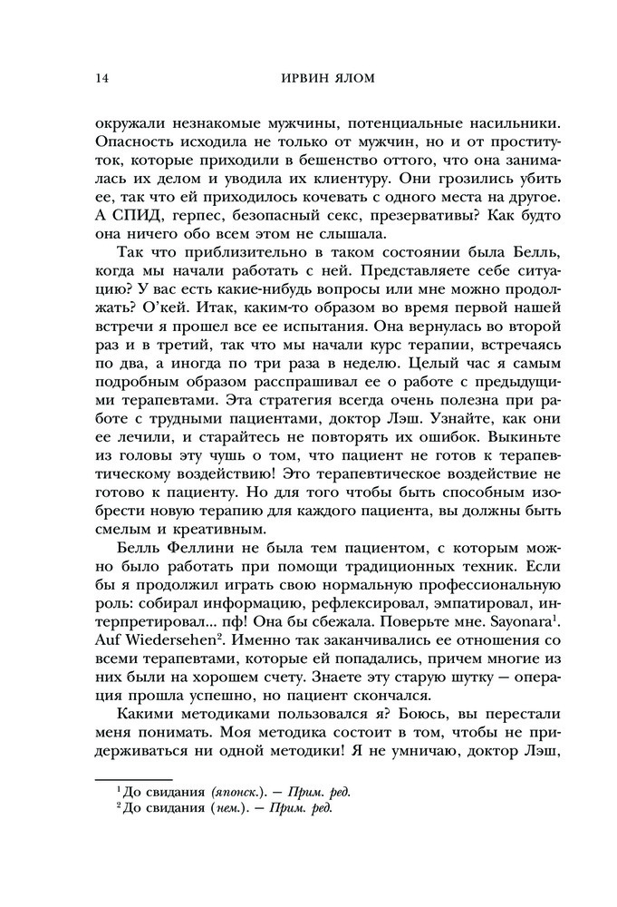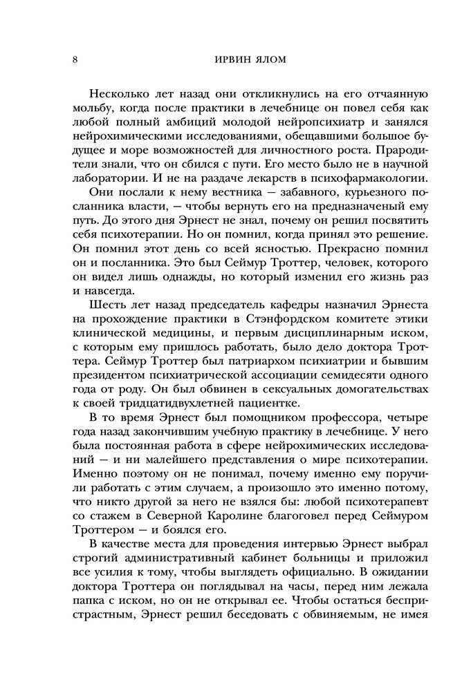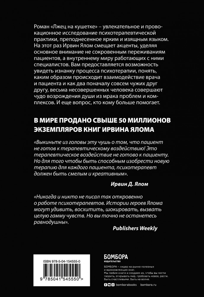 Серия: Ирвин Ялом. Мировые бестселлеры (обложка) Интригующий сюжет, потрясающие открытия, проницательный и беспристрастный взгляд на терапевтическую работу. Ялом показывает изнанку терапевтического процесса, позволяет читателю вкусить запретный плод и узнать, о чем же на самом деле думают психотерапевты во время сеансов. Книга Ялома — прекрасная смотровая площадка, с которой ясно видно, какие страсти владеют участниками психотерапевтического процесса. |
