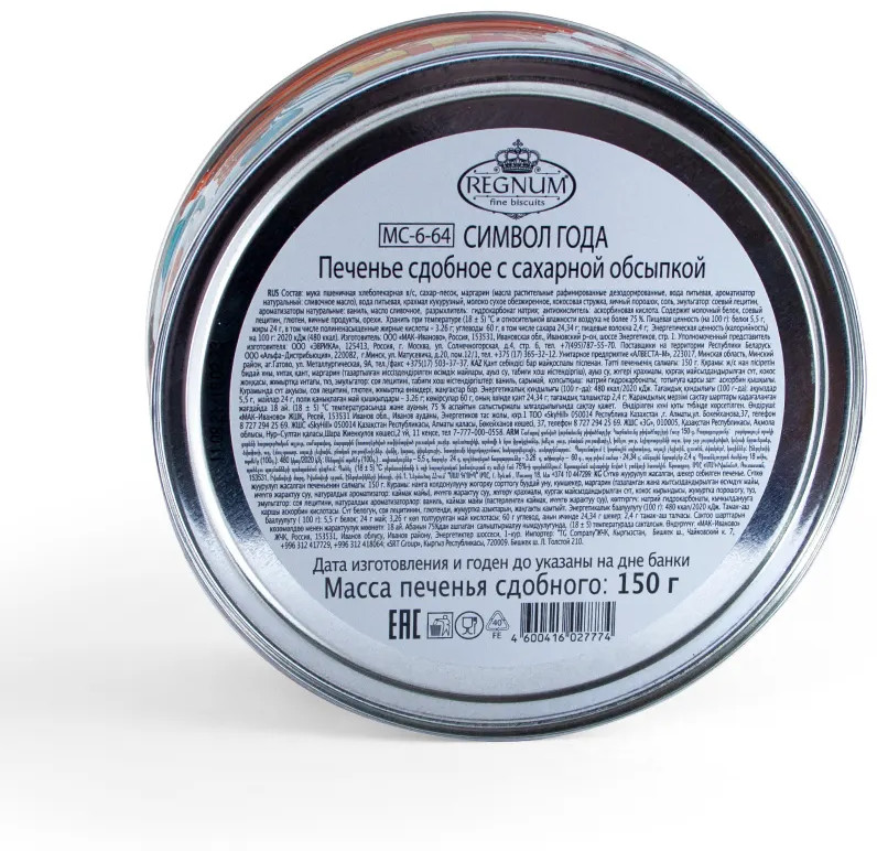 REGNUM Печенье сдобное «Символ года»В данный момент этот товар отсутствует в продаже. Возможно, у нас найдется аналогичный или похожий товар здесь. Такое печенье станет прекрасным подарком на новогодние праздники для детей и взрослых. При этом вручить банку можно как в качестве самостоятельного подарка, так и в качестве дополнения к основному. Когда печенье закончится жестяную банку можно использовать как емкость для сыпучих продуктов или выпечки. Дети любят складывать в них разные мелочи и маленькие игрушки. |