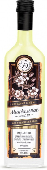 Миндальное масло «Благодарное» первого холодного отжима имеет обладает приятным ореховым привкусом и тонким ароматом марципана. Для отжима используются высушенные и перемолотые плоды сладкого миндаля. Содержит витамины Е, F, K, калий, кальций, магний, фосфор, железо, марганец, селен.