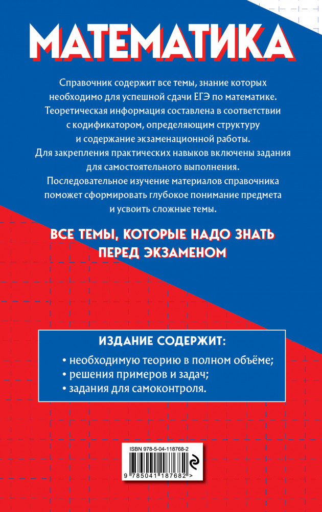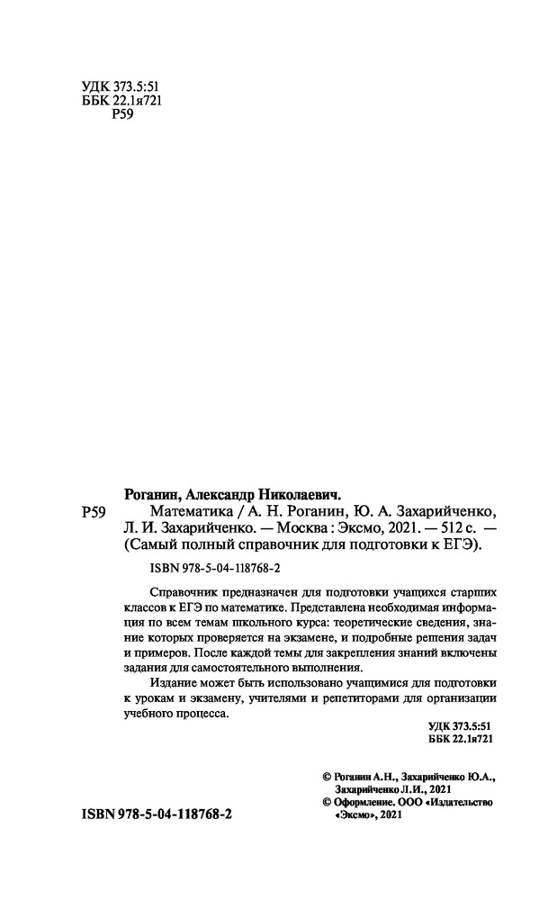 МатематикаЛилия Игоревна Захарийченко, Юрий Алексеевич Захарийченко, Александр Николаевич Роганин В данный момент этот товар отсутствует в продаже. Возможно, у нас найдется аналогичный или похожий товар здесь. Серия: Самый полный справочник для подготовки к ЕГЭ Справочник предназначен для подготовки учащихся старших классов к ЕГЭ по математике. Представлена необходимая информация по всем темам школьного курса: теоретические сведения, знание которых проверяется на экзамене, и подробные решения задач и примеров. После каждой темы для закрепления знаний включены задания для самостоятельного выполнения. Издание может быть использовано учащимися для подготовки к урокам и экзамену, учителями и репетиторами для организации учебного процесса. |