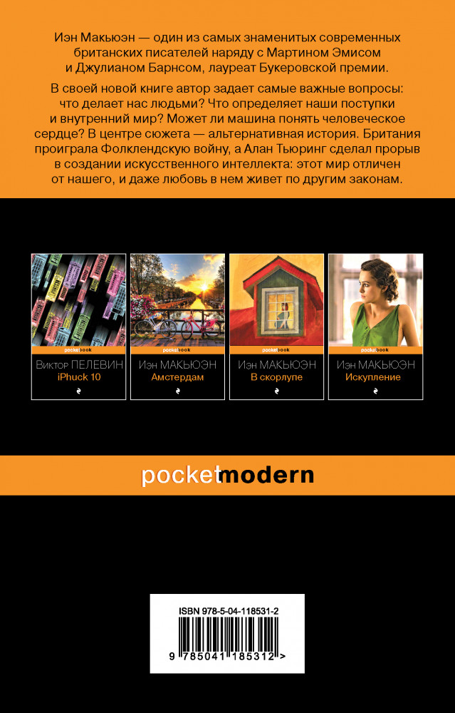 💳 Оплатить за товар можно при получении 🇰🇿 Есть бесплатная доставка по Казахстану от 1 дня 🎁 Копите бонусы с каждой покупки Серия: Pocket Book (обложка) В своей новой книге один из лучших британских писателей задает самые важные вопросы: что делает нас людьми? Что определяет наши поступки и внутренний мир? Может ли машина понять человеческое сердце? |