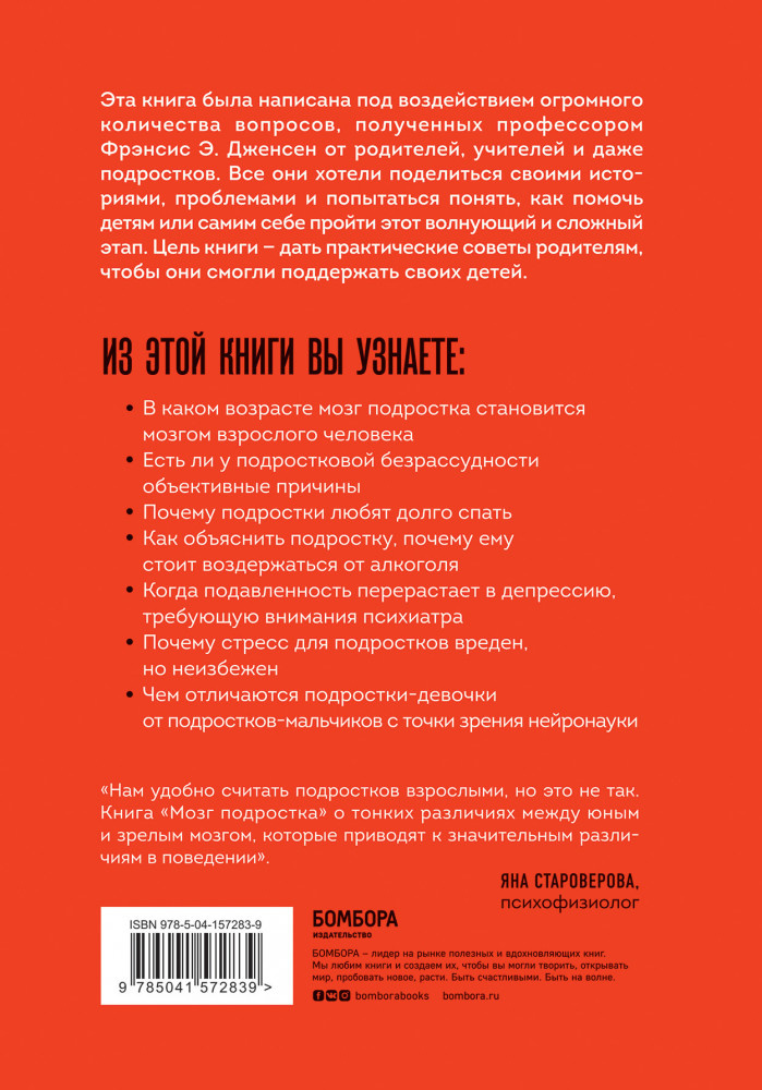 Мозг подростка. Спасительные рекомендации нейробиолога для родителей тинейджеровФрэнсис Э. Дженсен, Эми Эллис Натт В данный момент этот товар отсутствует в продаже. Возможно, у нас найдется аналогичный или похожий товар здесь. Серия: Психология. Мозговой штурм Эта книга была написана как ответ на многочисленные вопросы, полученные профессором Фрэнсис Э. Дженсен от родителей, учителей и даже от подростков. Все они хотели поделиться своими историями, спросить что-то и попытаться понять, как помочь их детям — или самим себе — пройти этот волнующий, но сложный переходный период. Цель книги — дать практические советы родителям, чтобы они смогли поддержать своих детей. Подростковый мозг находится на особенной ступени развития. Как расскажет эта книга, у подростков есть присущие только этому возрасту слабости, но при этом у них есть и необычайно сильные качества, которые исчезнут по мере взросления. |