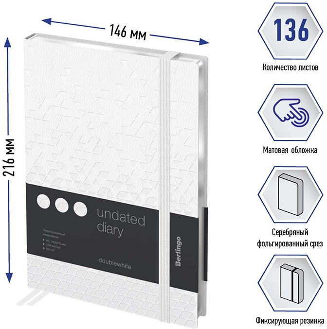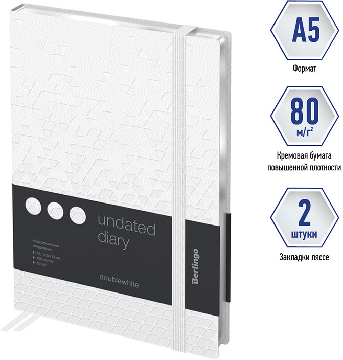Серия: DoubleWhite Недатированные ежедневники Berlingo «DoubleWhite» в полужеской обложке из искусственной кожи белого цвета с имиджевым тиснением. Серебряный срез блока. Вертикальная фиксирующая резинка. Внутренний блок из 136 листов высококачественной кремовой бумаги повышенной плотности 80 г/м², пантонная печать в 2 краски, справочный материал и перфорированные уголки. Две закладки-ляссе. Отрывные заметки, бланки извещения о ДТП и справочные материалы. 3 комплекта стикеров станут приятным подарком. Внутренний карман на заднем форзаце для хранения записей и заметок. Индивидуальная упаковка. Подходят под персонализацию |