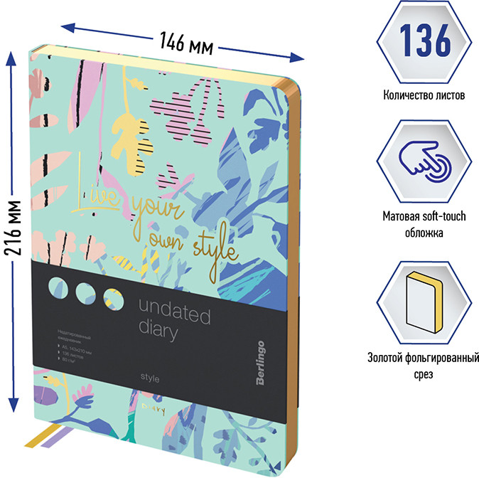 💳 Оплатить за товар можно при получении 🇰🇿 Есть бесплатная доставка по Казахстану от 1 дня 🎁 Копите бонусы с каждой покупки Серия: Style Недатированные ежедневники Berlingo «Style» в мягкой обложке из искусственной кожи с ярким дизайном. Мятный цвет фона обложки. Фольгированные элементы дизайна на обложке. Золотой срез блока. Внутренний блок из 136 листов высококачественной кремовой бумаги повышенной плотности 80 г/м², пантонная печать в 2 краски, справочный материал и перфорированные уголки. Две закладки-ляссе. Отрывные заметки, бланки извещения о ДТП и справочные материалы. 3 комплекта стикеров станут приятным подарком. Индивидуальная упаковка. Подходят под персонализацию |