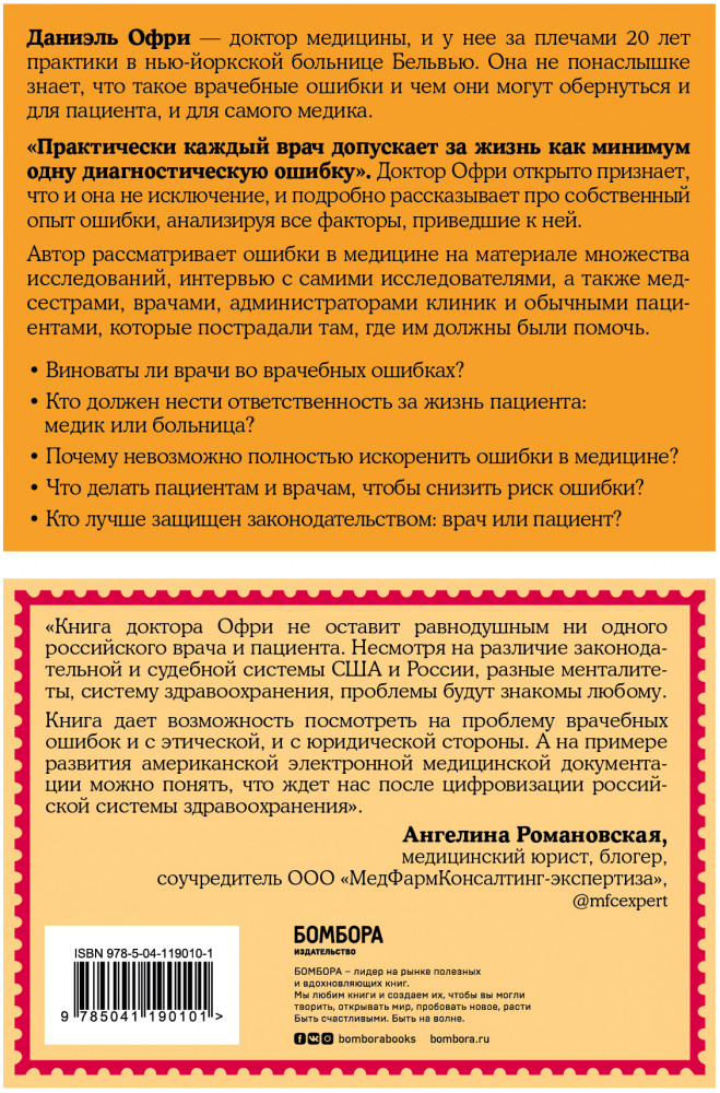 Неидеальная медицина. Кто виноват, когда в больнице что-то идет не так, и как пациенту при этом не пострадатьВ данный момент этот товар отсутствует в продаже. Возможно, у нас найдется аналогичный или похожий товар здесь. Серия: Врач и пациент: как говорить на одном языке Врачебные ошибки — неотъемлемая часть медицины. Ведь центральное место в ней занимают люди, которые лечат других или ищут способы делать это лучше. А людям свойственно ошибаться. Доктор Даниэль Офри описывает незаурядные случаи врачебных ошибок и анализирует их с точки зрения того, как их можно было предотвратить. |