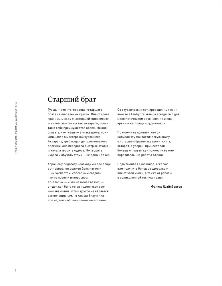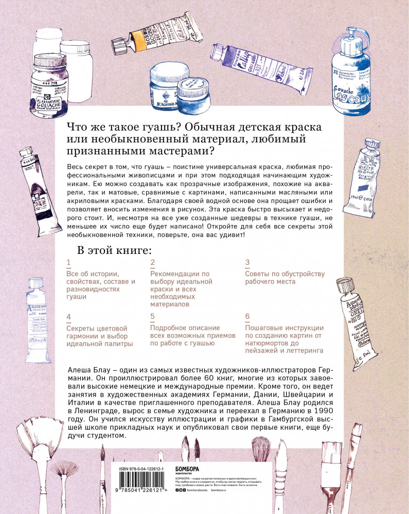 Серия: Рисование, которое вдохновляет. Стили, идеи и техники Гуашь — краска высокого искусства, такие великие мастера как Дюрер, Матисс и Шагал писали ею, а также ценили ее изысканность. Поэтому она так любима профессиональными художниками по сей день. При этом дети обычно делают свои первые шаги в рисовании именно гуашью, ведь для того, чтобы писать ею, не требуется никаких сложных приготовлений. Так что она идеально подойдет и новичкам. Автор этой книги — Алеша Блау, известный европейский иллюстратор родом из Ленинграда. Благодаря его советам вы узнаете много нового о такой привычной с детства технике живописи. Вы легко научитесь ориентироваться на рынке материалов для работы и подберете идеальную краску для себя, обустроите удобное рабочее пространство и освоите множество различных приемов рисования гуашью. Опираясь на пошаговые инструкции, вы создадите множество собственных шедевров в этой удивительной технике: от натюрмортов до пейзажей и портретов! |