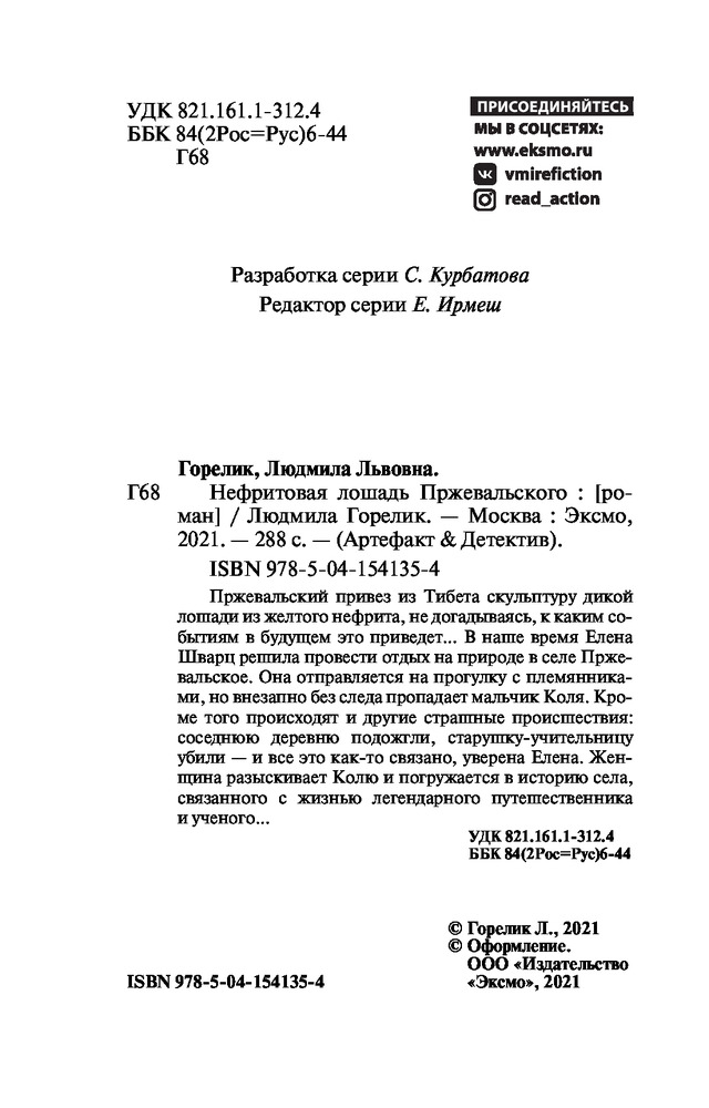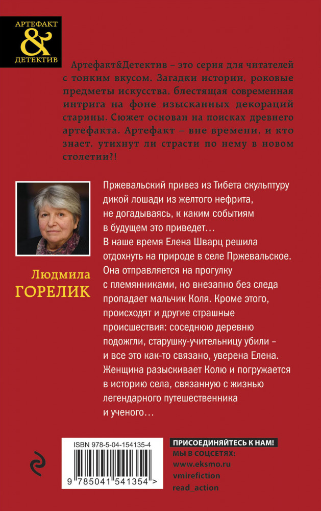 Нефритовая лошадь ПржевальскогоВ данный момент этот товар отсутствует в продаже. Возможно, у нас найдется аналогичный или похожий товар здесь. Серия: Артефакт & Детектив (обложка) Пржевальский привез из Тибета скульптуру дикой лошади из желтого нефрита, не догадываясь, к каким событиям в будущем это приведет... В наше время Елена Шварц решила провести отдых на природе в селе Пржевальское. Она отправляется на прогулку с племянниками, но внезапно без следа пропадает мальчик Коля. Кроме этого происходят и другие страшные происшествия: соседнюю деревню подожгли, старушку-учительницу убили — и все это как-то связано, уверена Елена. Женщина разыскивает Колю и погружается в историю села, связанного с жизнью легендарного путешественника и ученого... |