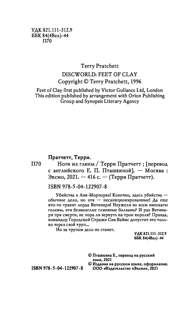 💳 Оплатить за товар можно при получении 🇰🇿 Есть бесплатная доставка по Казахстану от 1 дня 🎁 Копите бонусы с каждой покупки Серия: Терри Пратчетт Убийства в Анк-Морпорке! Конечно, здесь убийства — обычное дело, но эти — несанкционированные! Да ещё кто-то травит лорда Витинари! Неужели во всём виноваты големы, эти безмозглые глиняные болваны? И раз Витинари при смерти, не пора ли вернуть на трон короля? Правда, командор Городской Стражи Сэм Ваймс допустит это только через свой труп... Но за трупом дело не станет. |