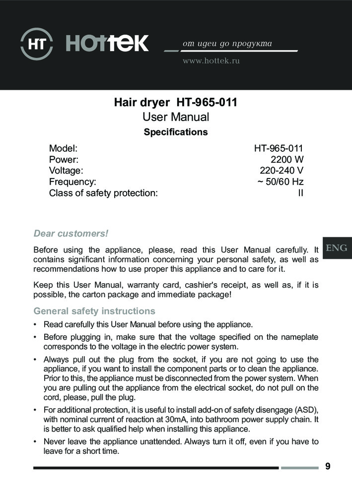 HOTTEK Фен HT-965-011В данный момент этот товар отсутствует в продаже. Возможно, у нас найдется аналогичный или похожий товар здесь. Фен Hottek HT-965-011 обеспечит мощный воздушный поток и быструю сушку волос. Благодаря функции Tourmaline Ionic (турмалиновая ионизация) Ваши волосы сохранят естественный блеск, не будут спутываться, и процесс сушки займет меньше времени. Прибор оснащен 3 режимами нагрева, 2 режимами интенсивности воздушного потока, а также функцией подачи холодного воздуха для закрепления укладки. Съёмный фильтр можно чистить от пыли и волос, так как данные каналы имеют свойство забиваться, что влияет на качество работы фена. |