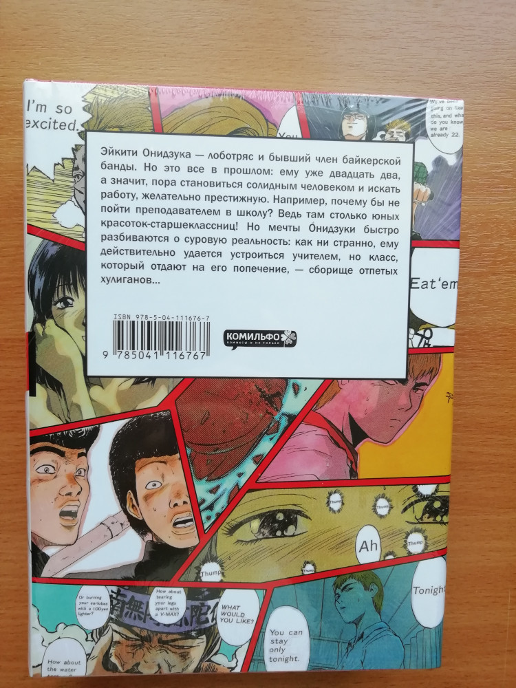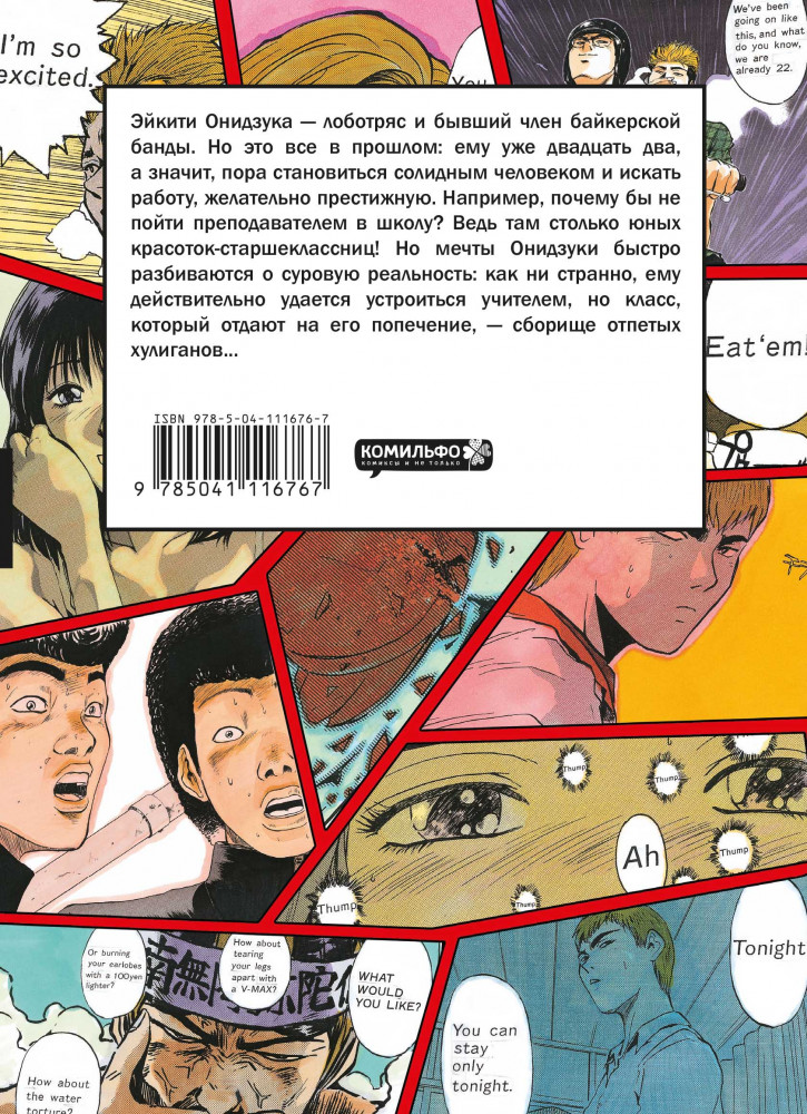 💳 Оплатить за товар можно при получении 🇰🇿 Есть бесплатная доставка по Казахстану от 1 дня 🎁 Копите бонусы с каждой покупки Серия: Комильфо. Манга Эйкити Онидзука — лоботряс и бывший член байкерской банды. Но это все в прошлом: ему уже двадцать два, а значит, пора становиться солидным человеком и искать работу, желательно престижную. Например, почему бы не пойти преподавателем в школу? Ведь там столько юных красоток-старшеклассниц! Но мечты Онидзуки быстро разбиваются о суровую реальность: как ни странно, ему действительно удается устроиться учителем, но класс, который отдают на его попечение, — сборище отпетых хулиганов... |