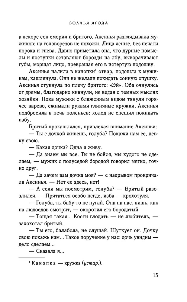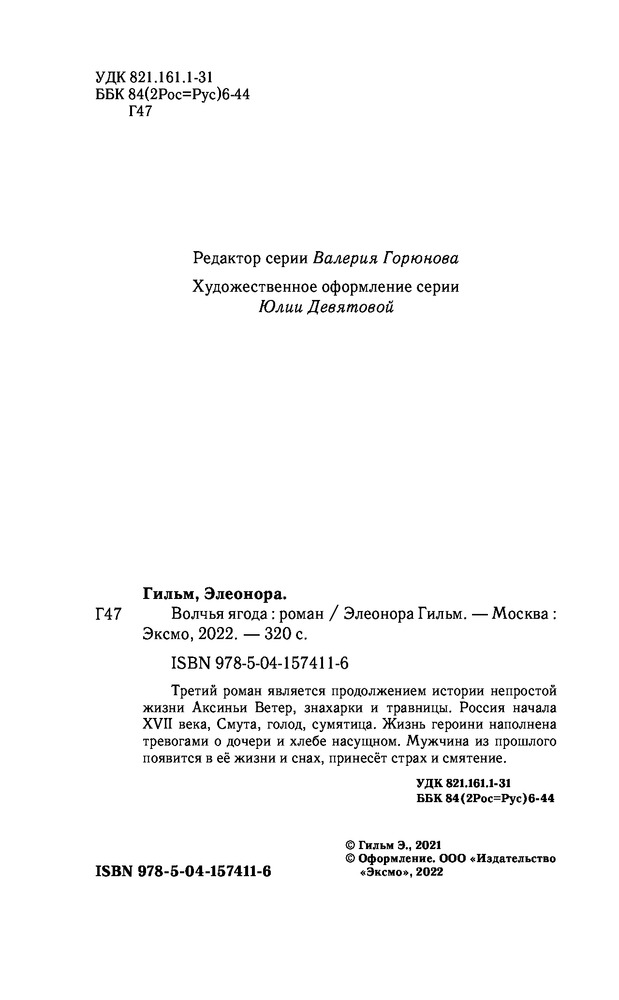 Волчья ягодаВ данный момент этот товар отсутствует в продаже. Возможно, у нас найдется аналогичный или похожий товар здесь. Серия: Я – женщина. Любовно-исторический роман Третий роман является продолжением истории непростой жизни Аксиньи Ветер, знахарки и травницы. Россия начала XVII века, Смута, голод, сумятица. Жизнь героини наполнена тревогами о дочери и хлебе насущном. Мужчина из прошлого появится в её жизни и снах, принесёт страх и смятение. |