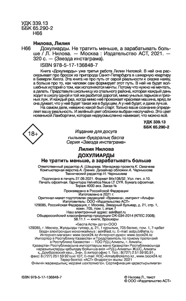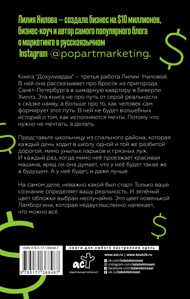 Дохулиарды. Не тратить меньше, а зарабатывать большеВ данный момент этот товар отсутствует в продаже. Возможно, у нас найдется аналогичный или похожий товар здесь. Серия: Звезда инстаграма Книга «Дохулиарды» уже третья работа Лилии Ниловой. В ней она рассказывает про бросок из пригорода Санкт-Петербурга в шикарную квартиру в Беверли Хиллз. Эта книга не про путь от серой реальности к сказке наяву, а больше про то, как человек сам формирует этот путь. В ней не будет волшебных историй о том, как исполняются мечты. Потому что нужно не мечтать, а делать. Представьте школьницу из спального района, которая каждый день ходит в школу одной и той же разбитой дорогой, мимо унылых ларьков и грязных луж. И каждый раз, когда мимо неё проезжает красивая машина, вряд ли она думает, что у неё будет такая же в будущем. А у неё будет, и даже лучше. |