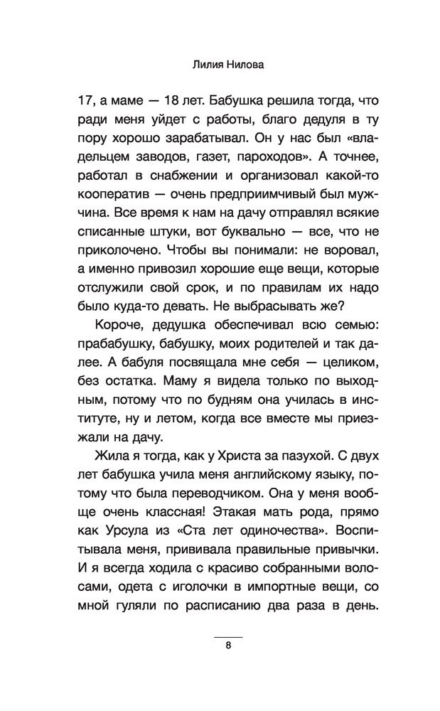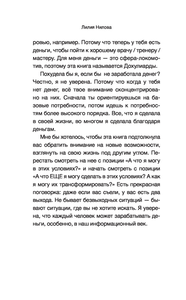На одном дыхании… Лиля любит поболтать, но очень увлекательно! Эта книга - история успеха Лилии Ниловой. По моему мнению, пример достойный восхищения. Она простым человеческим языком делится своим житейским опытом: где-то не очень удачным, но мотивирующим и ещё раз доказывающим, что всё в наших руках.