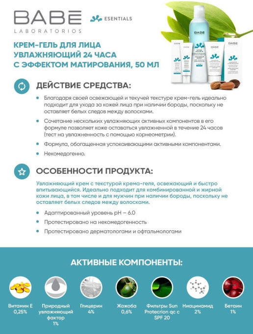 Laboratorios Babé Крем-гель для лица увлажняющий+300 хорошее увлажнение лёгкая текстура быстро впитывается некомедогенно