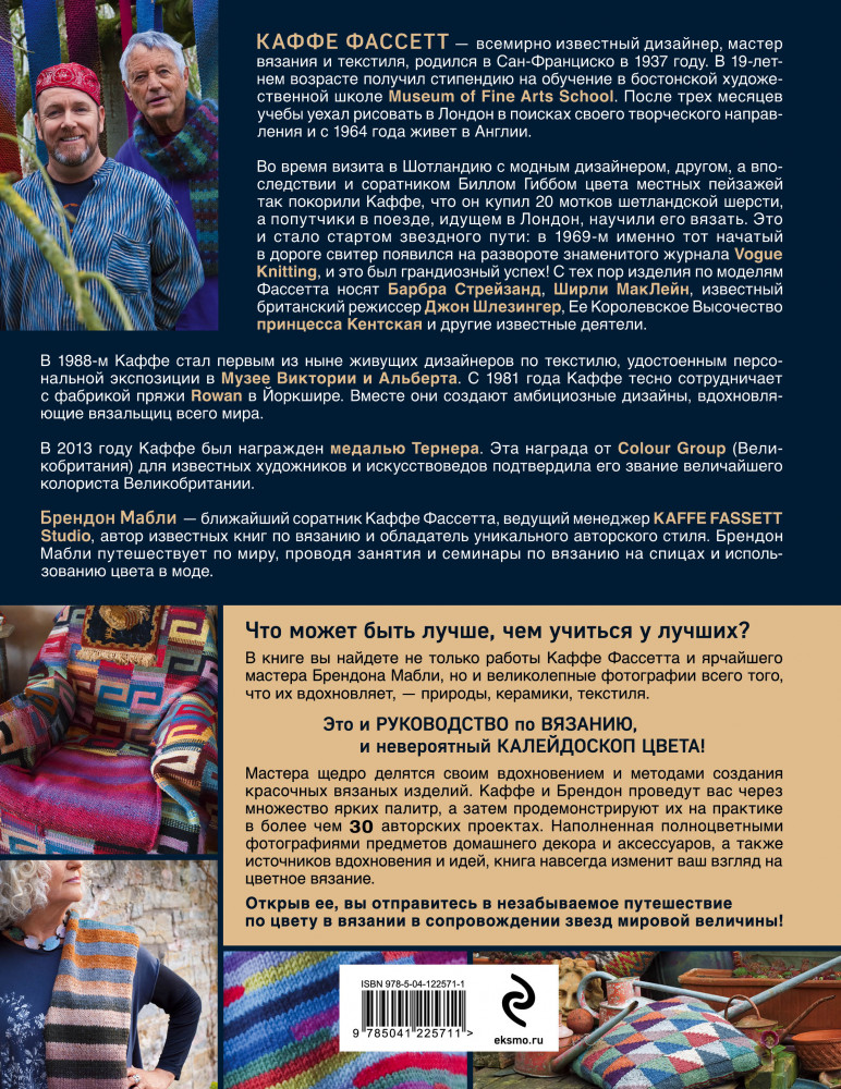Короли цвета, гуру вязания. Вдохновение, идеи, проекты Kaffe Fassett StudioВ данный момент этот товар отсутствует в продаже. Возможно, у нас найдется аналогичный или похожий товар здесь. Серия: Мировые звезды рукоделия Первая книга на русском языке от великолепного мастера, короля цвета, единственного дизайнера вязаных изделий, удостоенного персональной экспозиции в музее Виктории и Альберта в Лондоне. Его модели носят и знаменитости, включая Барбару Стрейзанд, и даже особы Королевского двора. В книге вы найдете не только работы самого Каффе Фассета, но и произведения его единомышленника и друга Брендона Мабли. Каждый проект, несмотря на визуальную сложность и эффектность, легко воплотить, следуя подробным пошаговым инструкциям. Мастера даже советуют как подобрать замену предлагаемой ими пряже, если вы не сможете ее найти. 15 потрясающих воображение проектов, потрясающие фотографии, дарящие вдохновение и приглашающие в творческий полет по миру вязаной колористики. Мечта многих вязальщиц сегодня осуществится, корифеи заговорят с ними на родном языке! Невероятный калейдоскоп цвета! |