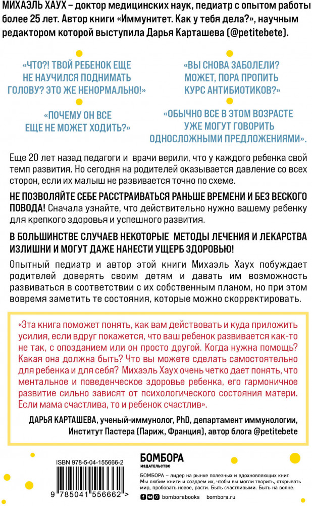 Михаэль Хаух, врач-педиатр с 25-летним опытом, автор книги «Иммунитет. Как у тебя дела?», очень четко дает понять, что ментальное и поведенческое здоровье ребенка, его гармоничное развитие сильно зависит от психологического состояния матери. Если мама счастлива, то и ребенок тоже. В этой книге он постарался успокоить всех, кто тревожится необоснованно, и разобрать случаи, когда беспокойство оправдано. Быть родителями и детьми стало сложнее, и доктор Хаух пытается не только понять, что именно послужило тому причиной, но и как с этим справиться. Внимание! Информация, содержащаяся в книге, не может служить заменой консультации врача. Перед совершением любых рекомендуемых действий необходимо проконсультироваться со специалистом. |