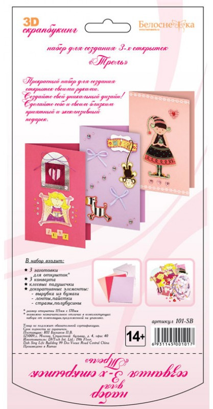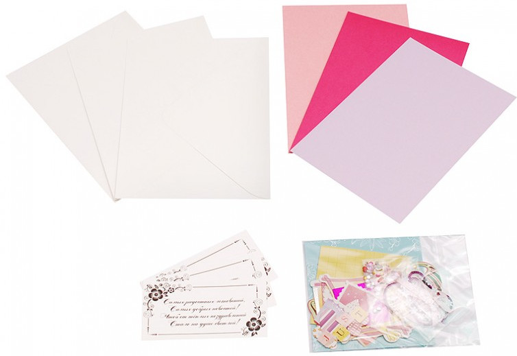 Красивые стильные наборы для изготовления открыток своими руками — это прекрасный подарок для любого праздника. Наборы комплектуются цветными заготовками для открыток, ленточками, тесьмой, стразами разных форм. В набор вложен комплект вырубки из картона — забавные фигурки, сердечки, рамки, игрушки и 3 карточки с маленькими поздравительными стихами. Еще одна отличительная особенность — на внутренней стороне вкладыша напечатаны карточки для скрапбукинга, их можно вырезать и использовать при создании своей композиции.