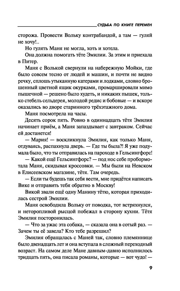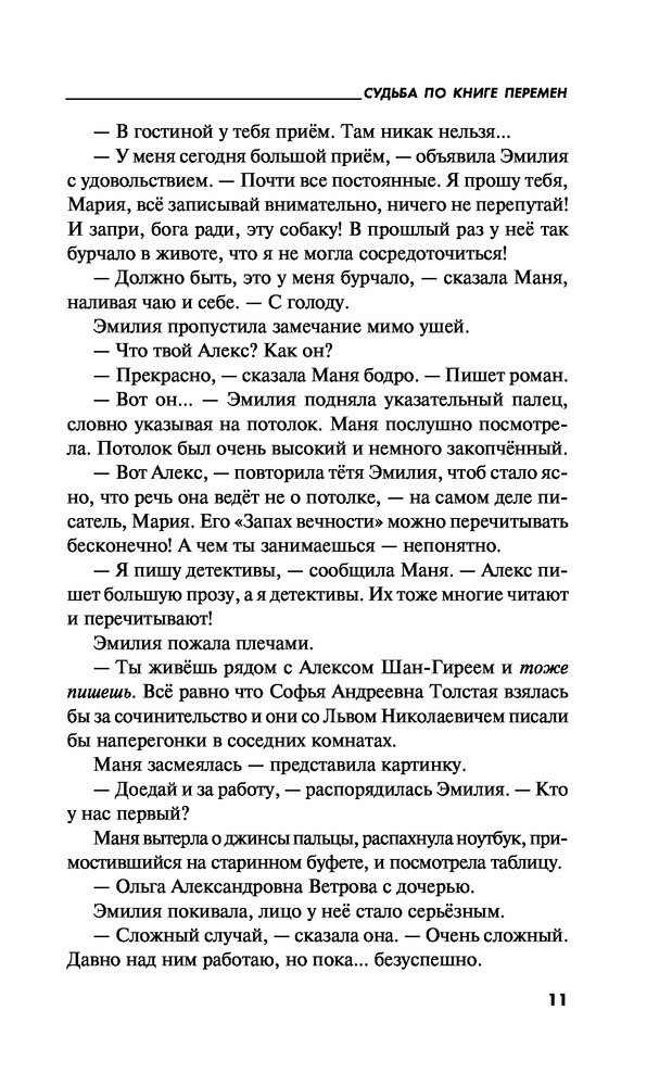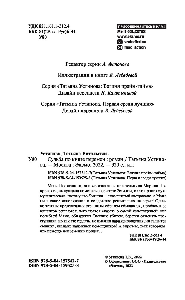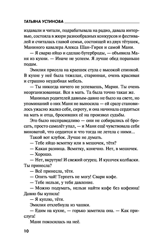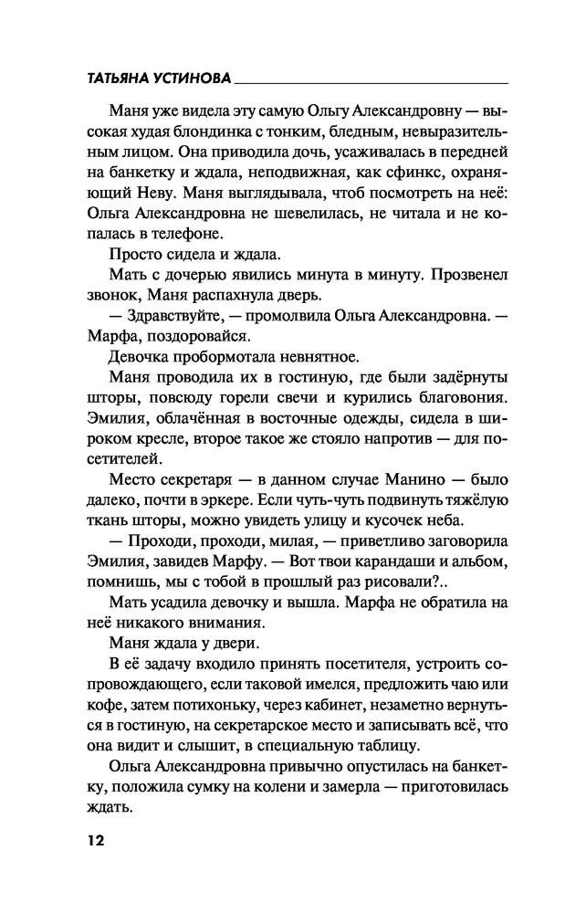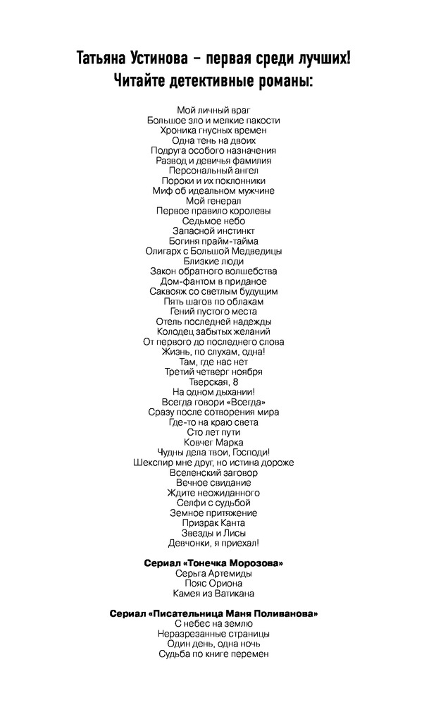 Судьба по книге переменВ данный момент этот товар отсутствует в продаже. Возможно, у нас найдется аналогичный или похожий товар здесь. Серия: Татьяна Устинова: Богиня прайм-тайма Маня Поливанова, она же известная писательница Марина Покровская, вынуждена помогать своей тете Эмилии, и это просто мука мученическая, потому что Эмилия — знаменитый экстрасенс, а Маня ни в какое ясновидение и колдовство решительно не верит! Однако тетины предсказания странным образом сбываются, проблемы ее клиентов решаются, чего нельзя сказать о самой ясновидящей: она погибает! Маня, обнаружив Эмилию убитой, берется отыскать преступника, но как это сделать, ни имея ни дара ясновидения, ни талантов сыщика, ни даже надежных помощников? А, впрочем, тетя говорила, что помощь непременно придет... |