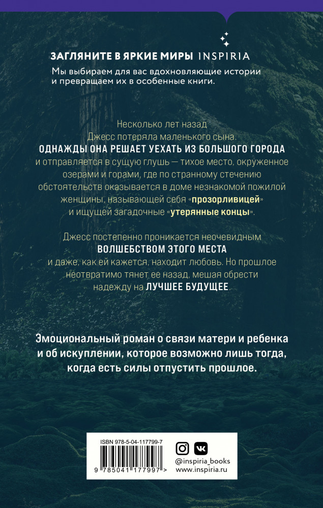 В данный момент этот товар отсутствует в продаже. Возможно, у нас найдется аналогичный или похожий товар здесь. Серия: Novel. Обыкновенная магия Несколько лет назад Джесс потеряла маленького сына. Однажды она срывается из большого города и едет в сущую глушь — тихое место, окруженное озерами и горами, где по странному стечению обстоятельств оказывается в доме незнакомой пожилой женщины, называющей себя «прозорливицей» и ищущей загадочные «утерянные концы». Джесс постепенно проникается неочевидным волшебством своего нового дома и даже, как ей кажется, находит любовь. Но прошлое неотвратимо тянет ее назад, мешая обрести веру в добро и лучшее будущее. Мелисса Пейн создала красивый, загадочный и немного меланхоличный мир, которого иногда очень не хватает на контрасте с нашей прозаичной реальностью. Прекрасный образец магического реализма и романтической прозы. |