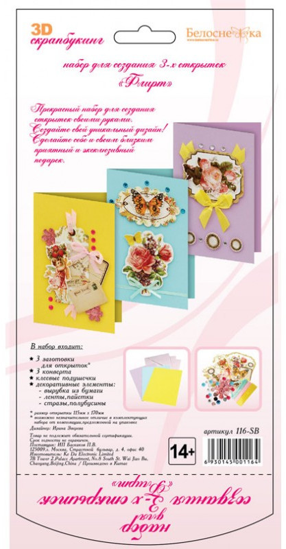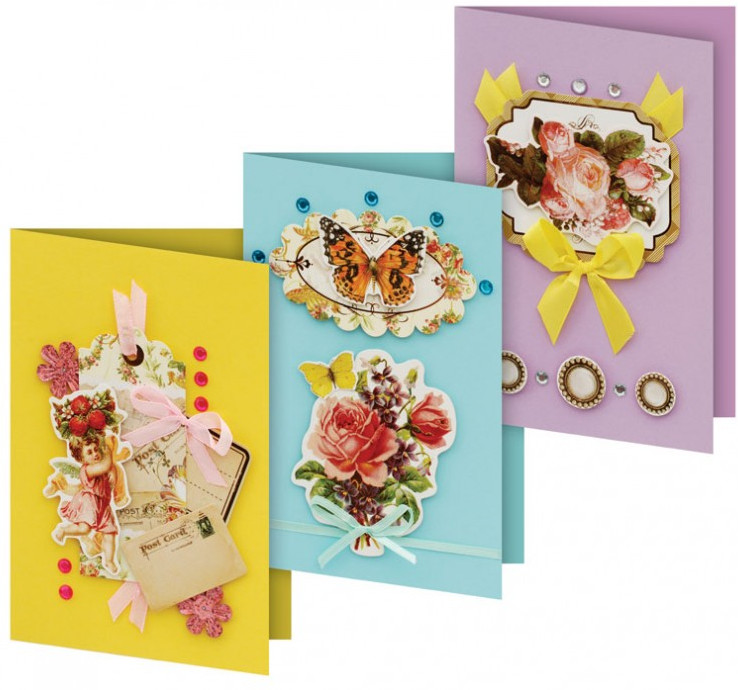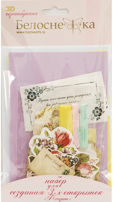 Наборы комплектуются цветными заготовками для открыток, ленточками, тесьмой и стразами разных форм. В каждый набор вложен комплект вырубки из картона — это красивые букеты, бабочки, карточки для надписей, рамки, игрушки, звездочки, воздушные шары и многое другое. В зависимости от модели вырубка будет разная. Еще одна отличительная особенность этих наборов на внутренней стороне вкладыша напечатаны карточки для скрапбукинга их можно вырезать и использовать при создании своей композиции.
