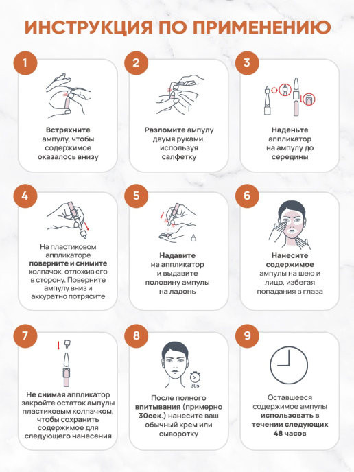2 ампулы, после вскрытия можно пользовать ещё 48 часов,так что можно на 4,5 применений. Мне нужно было ещё наносить крем поверх,ибо стягивает.сияния не увидела, эффекта если честно не поняла. Смутил запах подсолнечного масла.