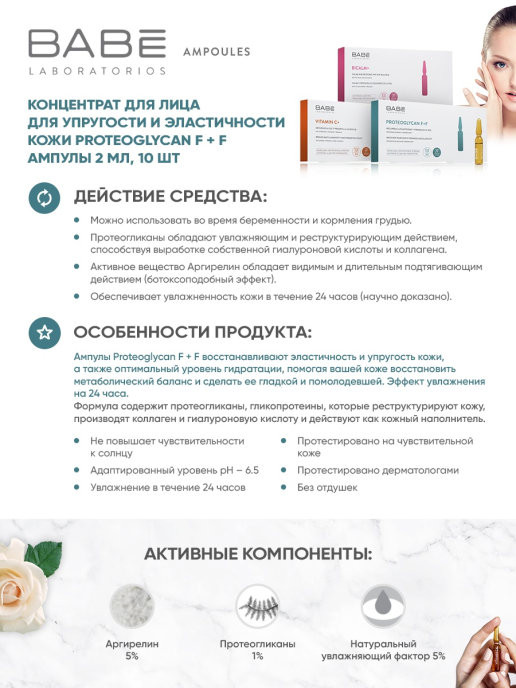 Laboratorios Babé Ампулы «Proteoglycan F+F»В данный момент этот товар отсутствует в продаже. Возможно, у нас найдется аналогичный или похожий товар здесь. Серия: Ampoules Ампулы восстанавливают эластичность и упругость кожи, а также оптимальный уровень гидратации, помогая коже восстановить метаболический баланс и сделать ее гладкой и помолодевшей. Эффект увлажнения на 24 часа. Формула содержит протеогликаны, гликопротеины, которые реструктурируют кожу, производят коллаген, гиалуроновую кислоту и действуют как кожный наполнитель. Подходят для всех типов кожи, в том числе в период беременности и кормления грудью. |