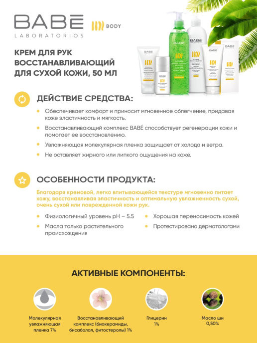 Laboratorios Babé Крем для рук восстанавливающий+175 увлажняет восстанавливает кожу легкая консистенция питает кожу нейтральный запах