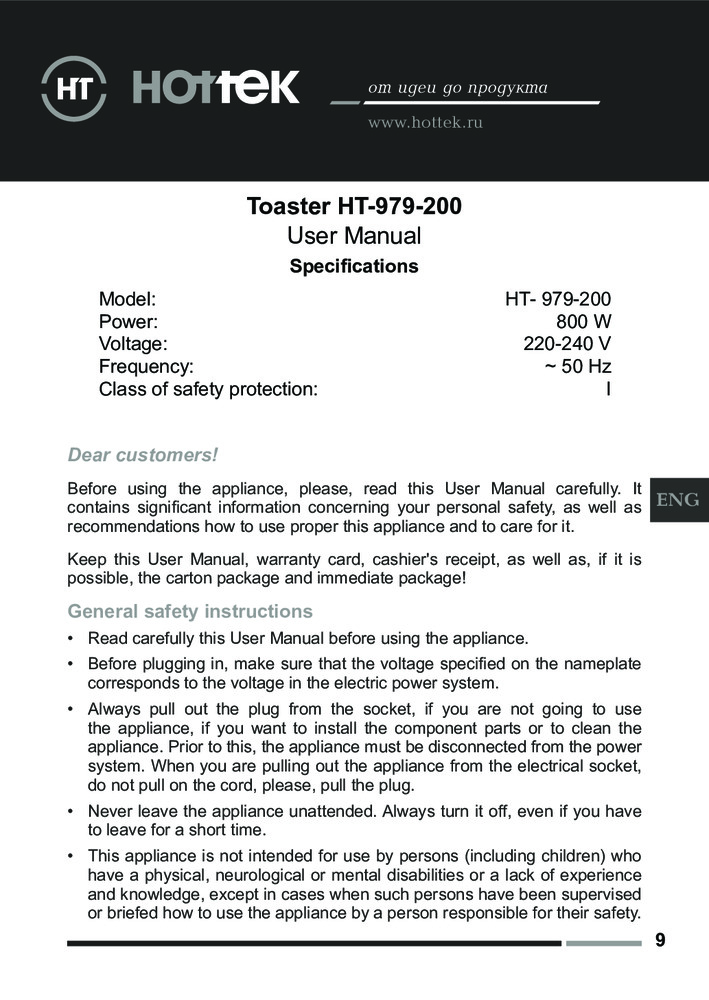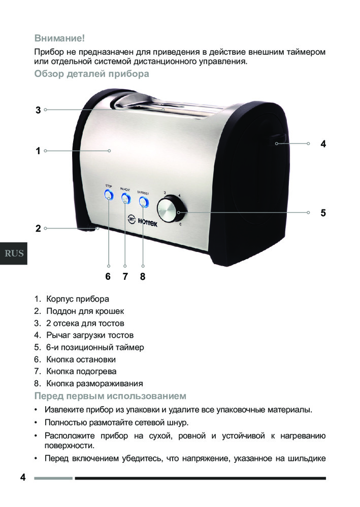 HOTTEK Тостер HT-979-200В данный момент этот товар отсутствует в продаже. Возможно, у нас найдется аналогичный или похожий товар здесь. Тостер с корпусом из нержавеющей стали идеально подойдет для любителей горячих сэндвичей и хрустящих тостов. Максимальная мощность устройства 800 Вт позволит быстро подогреть, поджарить или разморозить кусочки хлеба. Встроенная функция автоцентрирования выравнивает тосты для размеренной прожарки тостов. Тостер с подогревом имеет съемный поддон для крошек — облегчит очистку изделия. Техника для кухни имеет LED индикацию и 6 уровней поджарки — позволит приготовить тосты на любой вкус. |