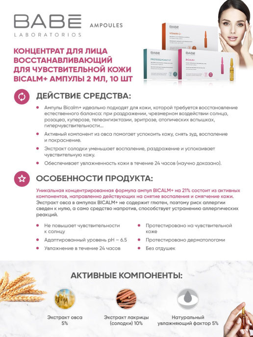 Laboratorios Babé Ампулы «Bicalm +»В данный момент этот товар отсутствует в продаже. Возможно, у нас найдется аналогичный или похожий товар здесь. Серия: Ampoules Ампулы Bicalm+ помогают облегчить состояние, успокаивают и восстанавливают кожу, восстанавливая ее естественный баланс. Уникальная концентрированная формула ампул Bicalm+ на 21% состоит из активных компонентов, направленно действующих на снятие воспаления и смягчение кожи. |