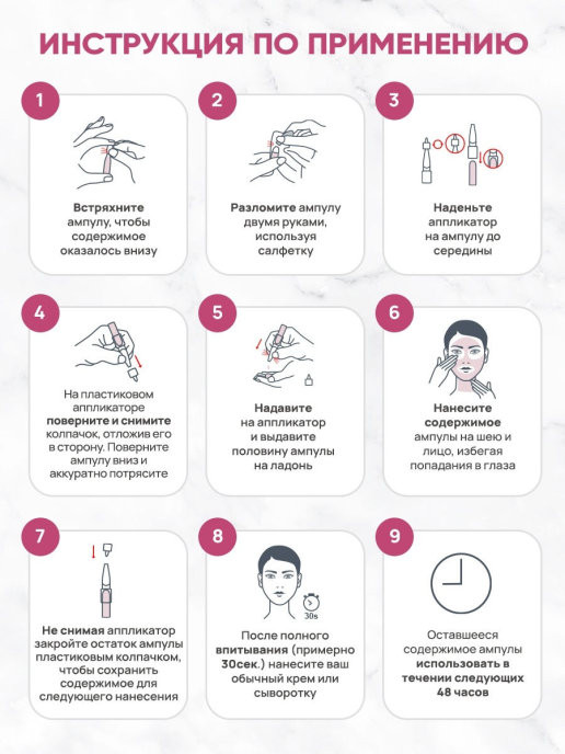 Липкая текстура. Кожа липкая очень долго. Эффект есть. Выравниваясь кожа. Чуть светлее стала. Одной ампулы на 4 р хватило. Сначала покраснела и душно коже стало. Но такого вау не увидела.