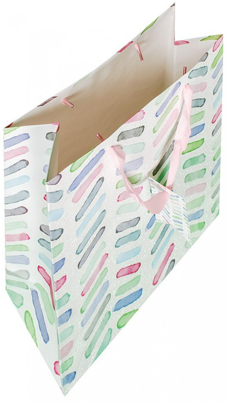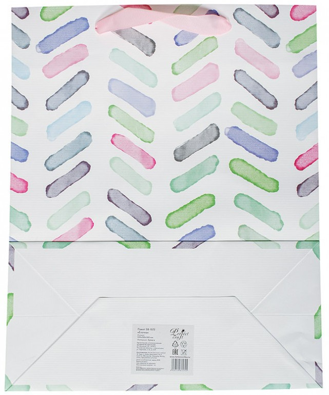 Для пакетов используется высококачественная плотная бумага с хорошим качеством печати рисунка, высокая плотность бумаги позволяет изделию прекрасно сохранять первоначальную форму. В процессе использования пакеты не расклеиваются и не рвутся, в качестве ручек для пакета используется атласная лента, закрепленная стопорами с внутренней стороны пакета. Пакет дополнен бумажными подвесами на ручках.